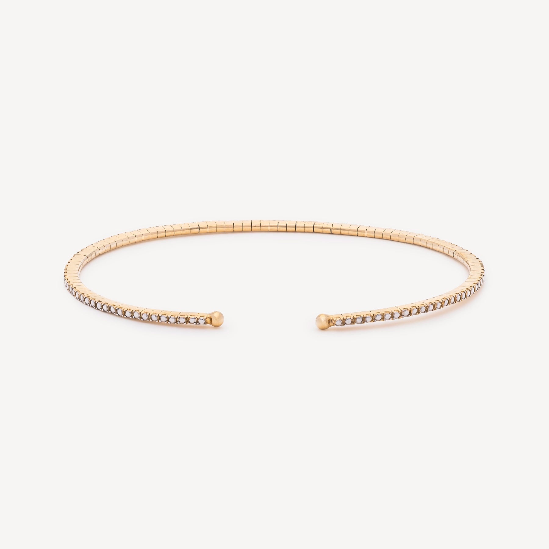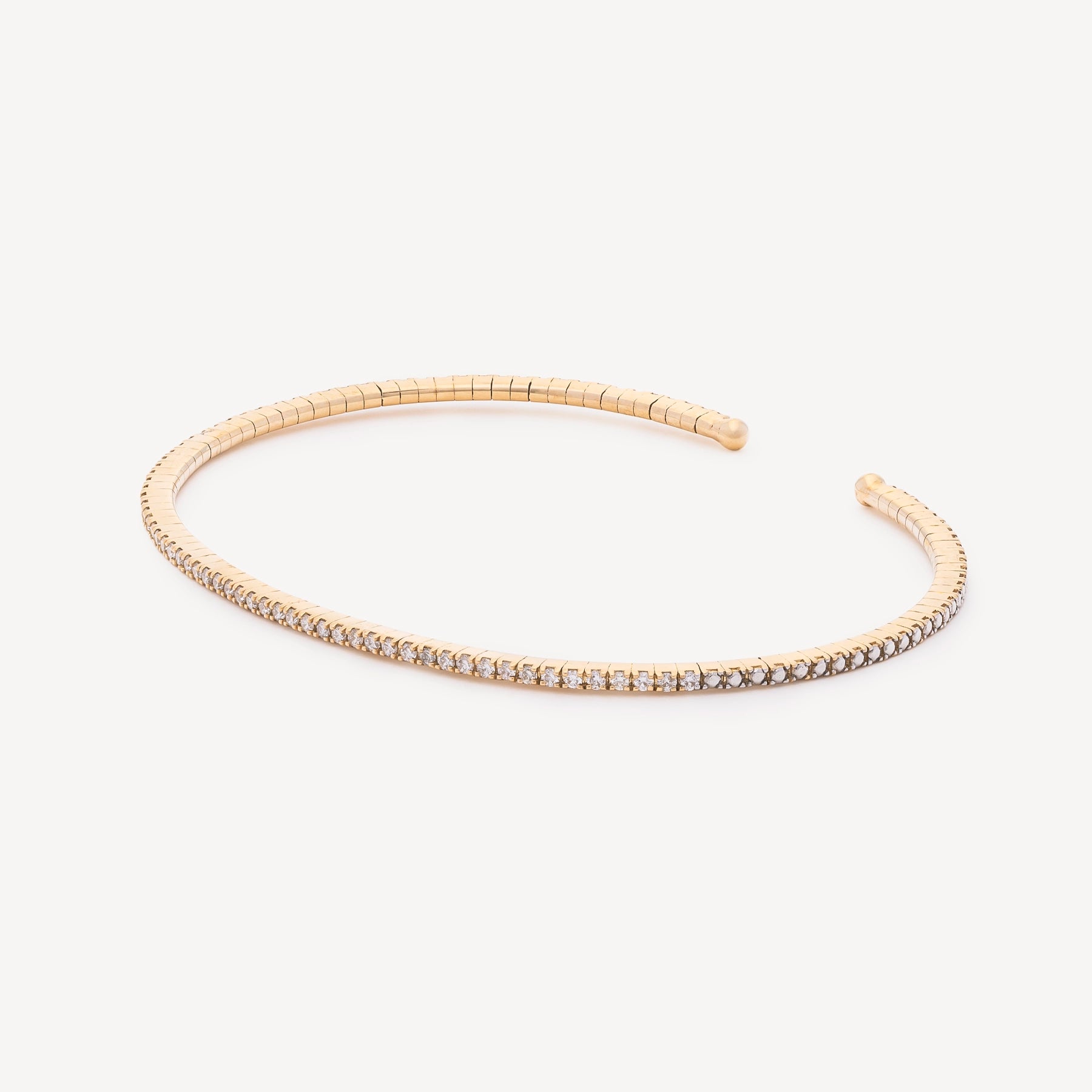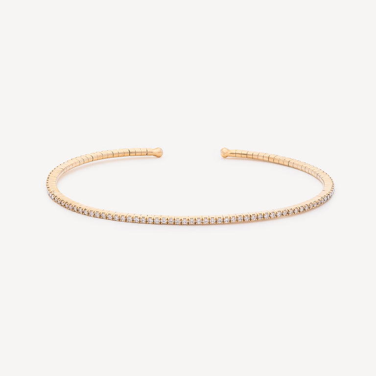 Ce jonc en or jaune pavé de 46 diamants incarne une vision contemporaine du bijou essentiel : une pièce qui ne se remarque pas par excès, mais par justesse. Sa ligne est nette, fluide, presque instinctive. Le pavage capte la lumière avec subtilité, créant un éclat constant, jamais ostentatoire. Plus accessible dans son approche, il n’en perd rien de son caractère : il reprend les codes d’un bijou que l’on choisit pour soi, et que l’on ne quitte plus. Pensé pour être porté seul dans une élégance discrète, ou en accumulation dans un esprit plus libre.