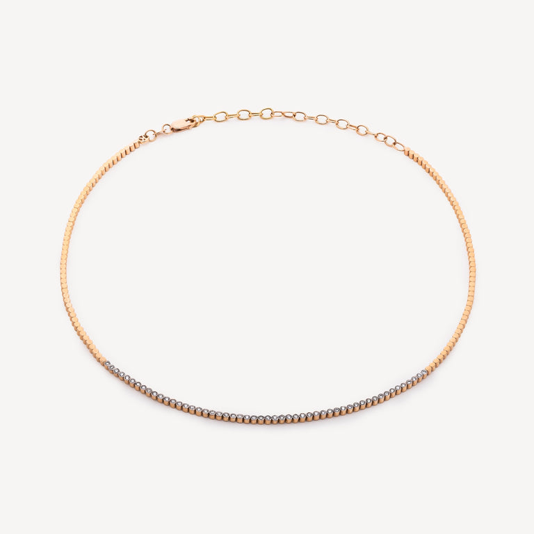 Ce collier choker en or rose illumine le cou avec un sertissage de diamants blancs, pour une brillance douce et raffinée.
