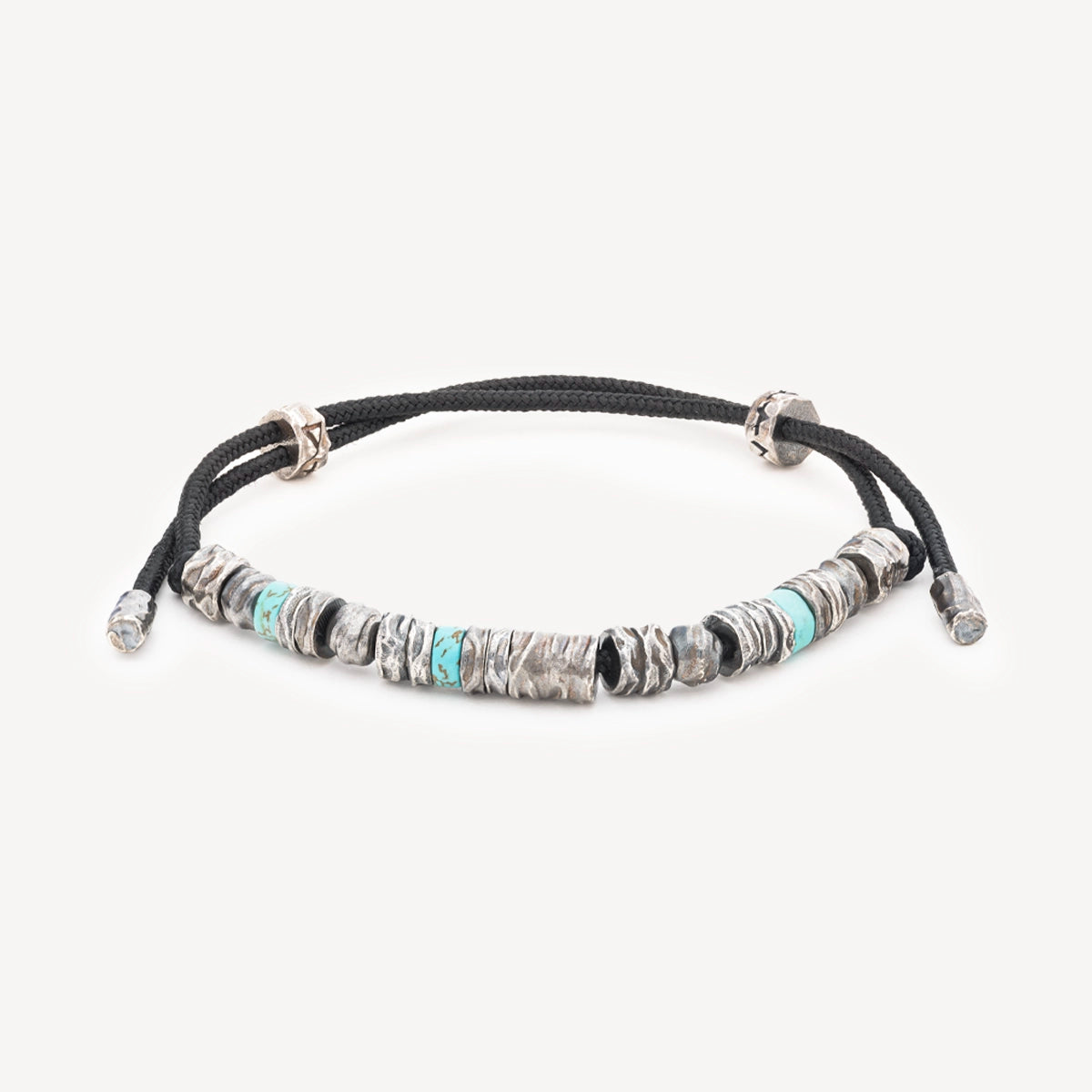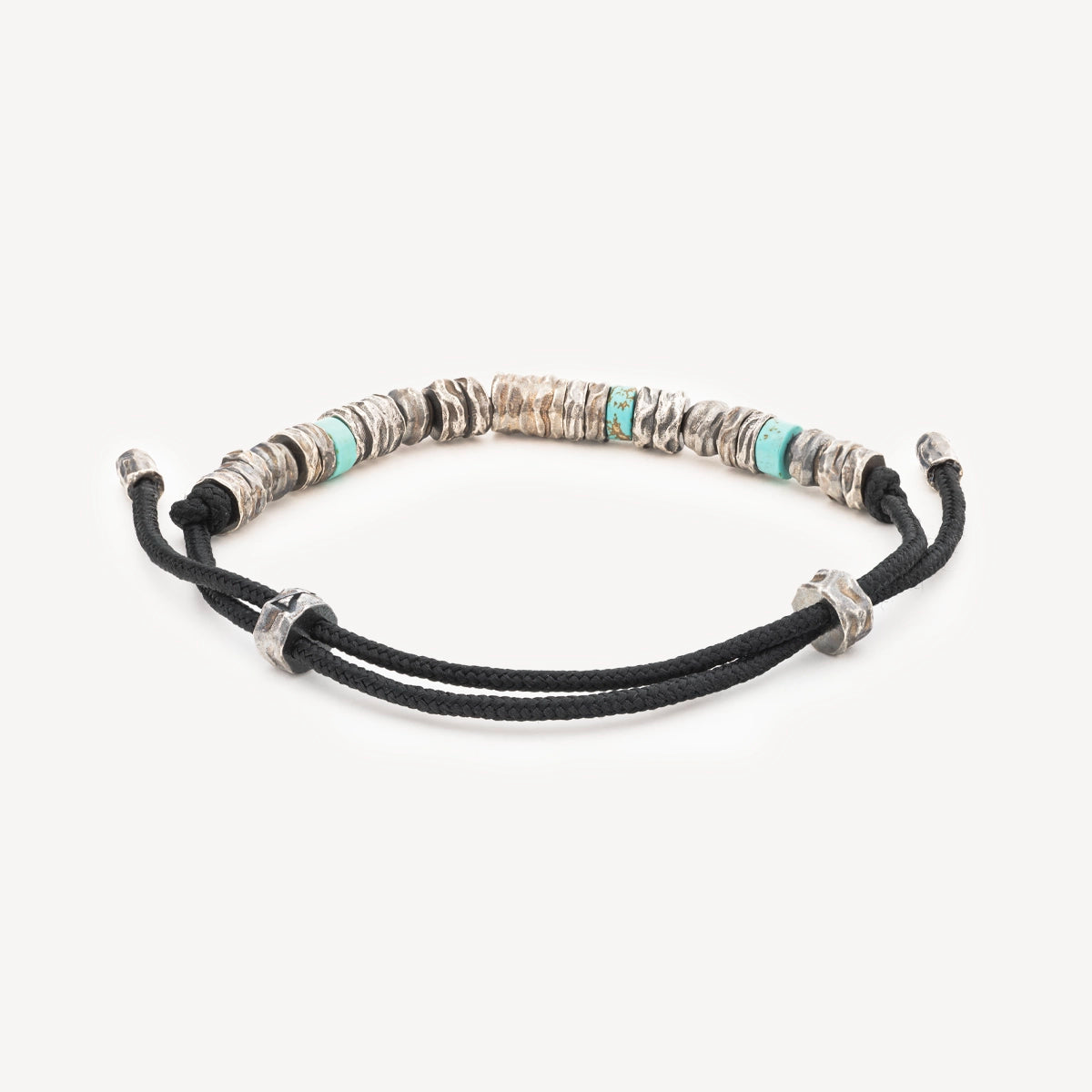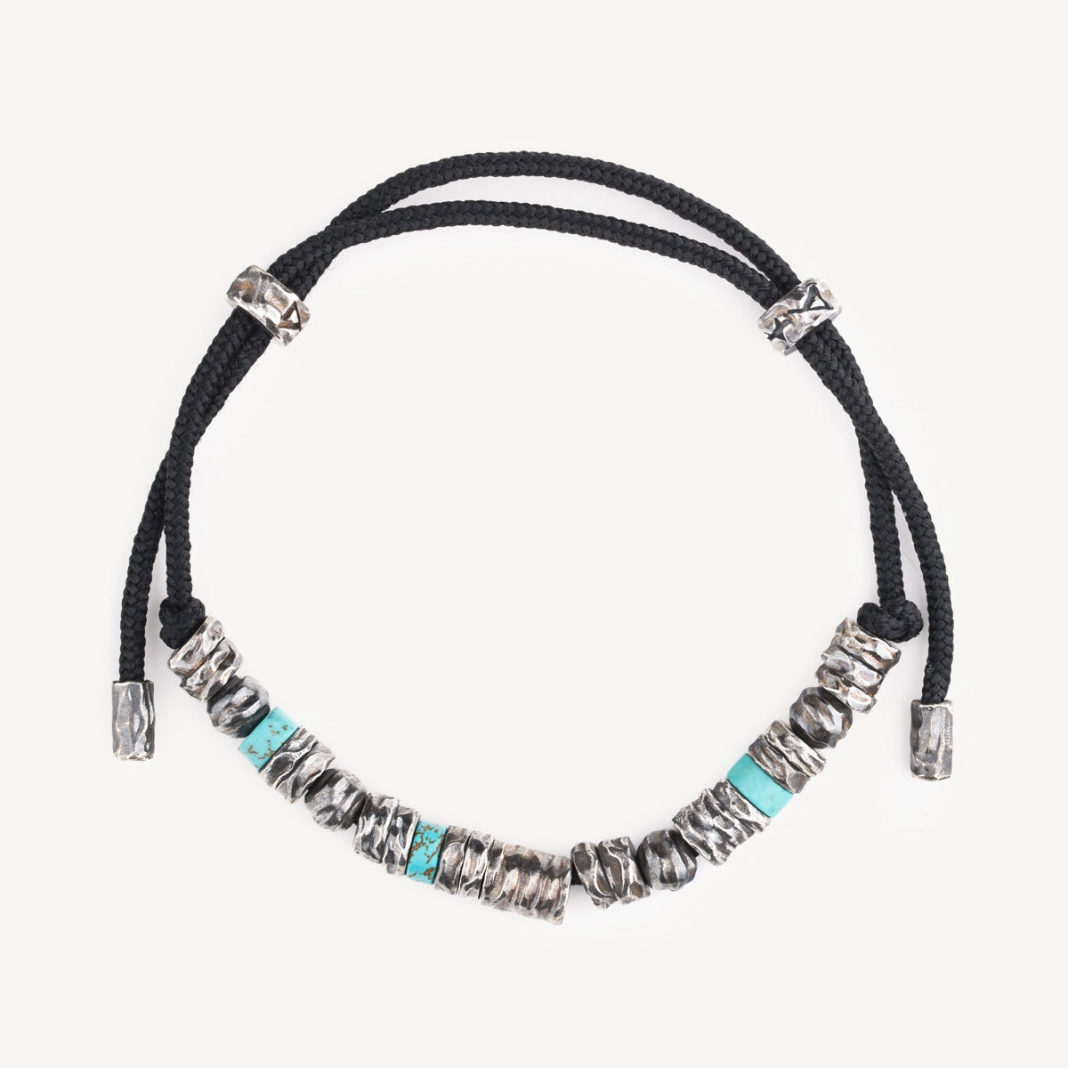 The Hollywood men's bracelet from the Los Angeles collection perfectly embodies the Mad Lords spirit, where authenticity meets instinctive elegance. Its discreet yet robust cord encircles turquoise beads alternating with silver beads, their intense blue evoking both the depths of the desert and the wild vibrations of an endless horizon. Each stone, unique in its hue, brings a raw and natural energy, while the silver transcends the classic codes of men's jewelry. Worn alone or stacked, this bracelet becomes a totem, a piece that not only adorns but also asserts an attitude, a perspective on the world, and the creative freedom characteristic of Mad Lords. Turquoise is often associated with protection and self-expression, lending this piece an almost spiritual dimension.