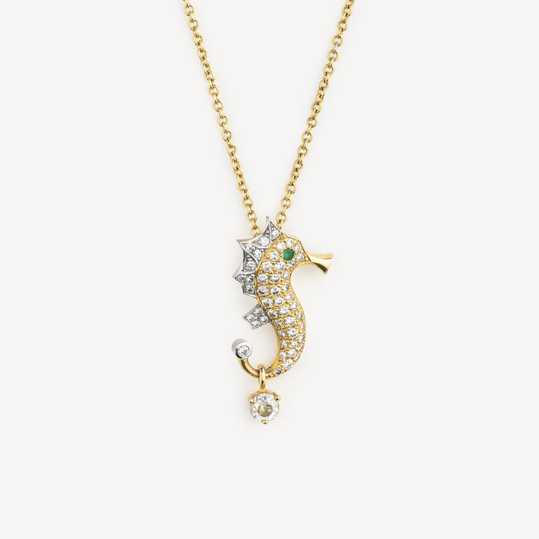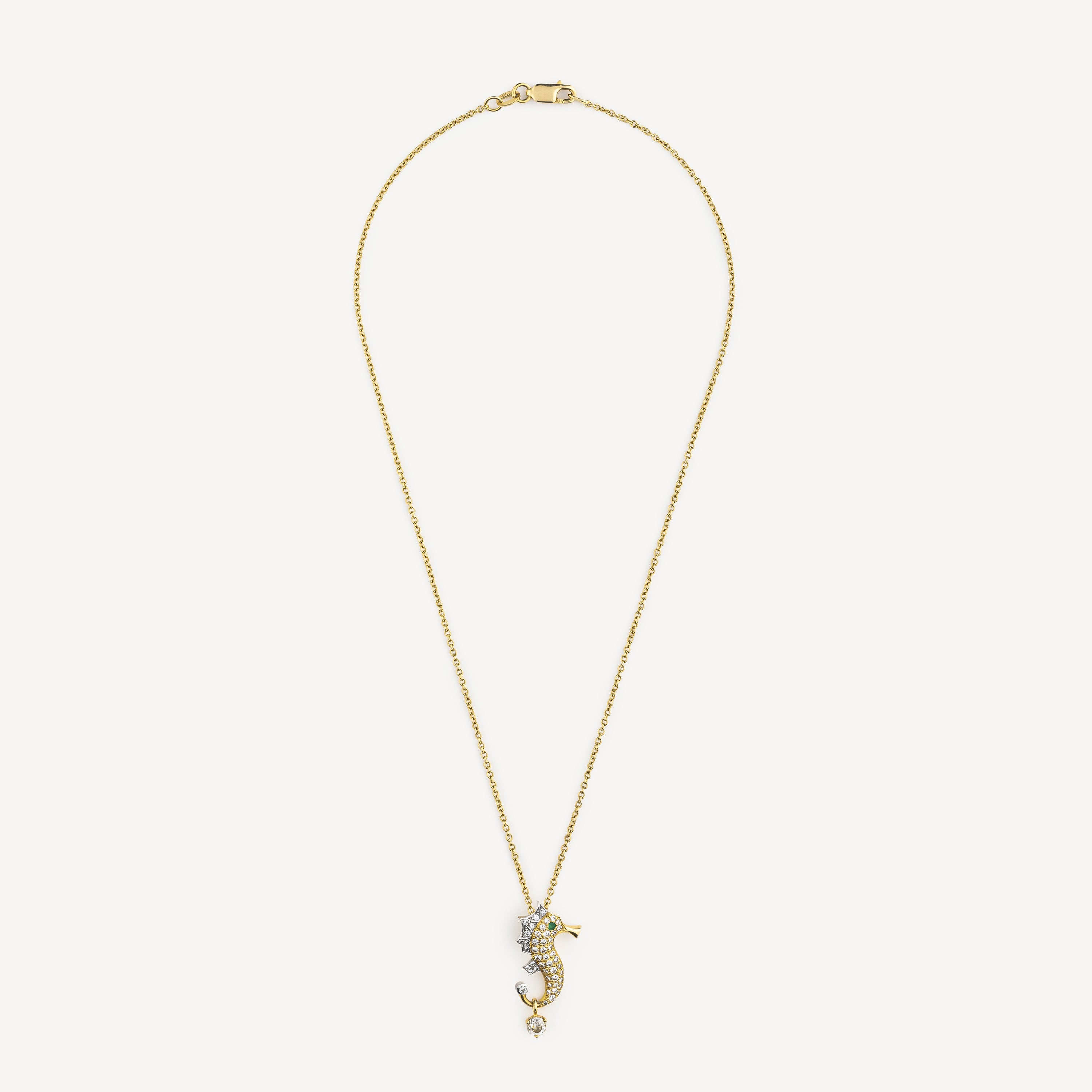 Yellow gold chain with a seahorse pendant in yellow and white gold, decorated with white diamonds, an emerald and a diamond tassel.