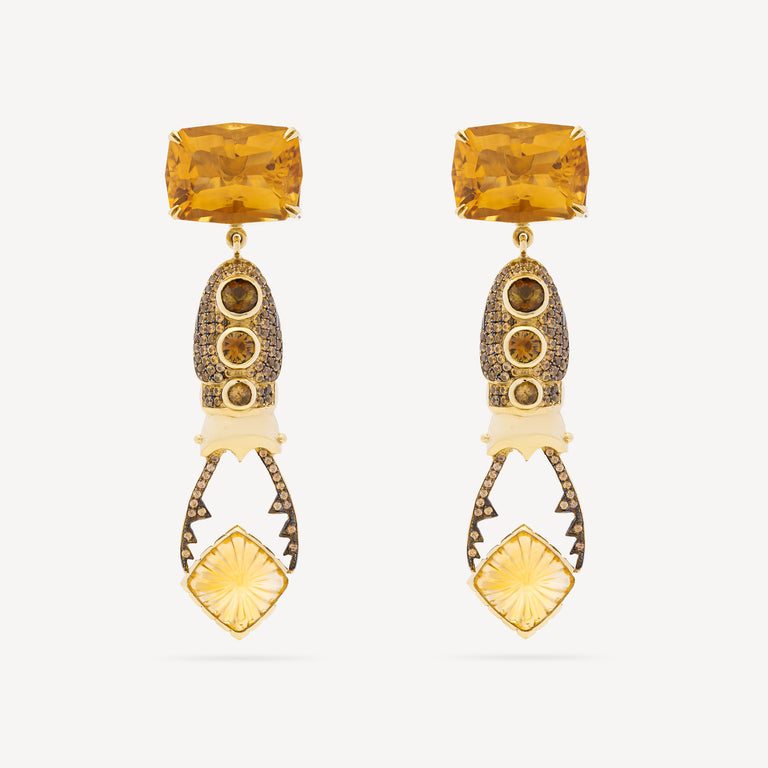 This pair of yellow gold earrings features two diamond-set scarabs encircling a citrine stone.