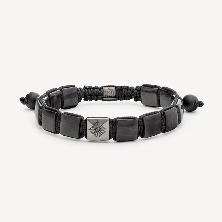 Bracelet mounted on a dark gray cord composed of 12 locks and 2 black ceramic beads: 13 brown sapphire locks, 1 black gold lock set with 2 black diamonds, 1 black gold lock set with a black diamond, and 2 black ceramic beads.