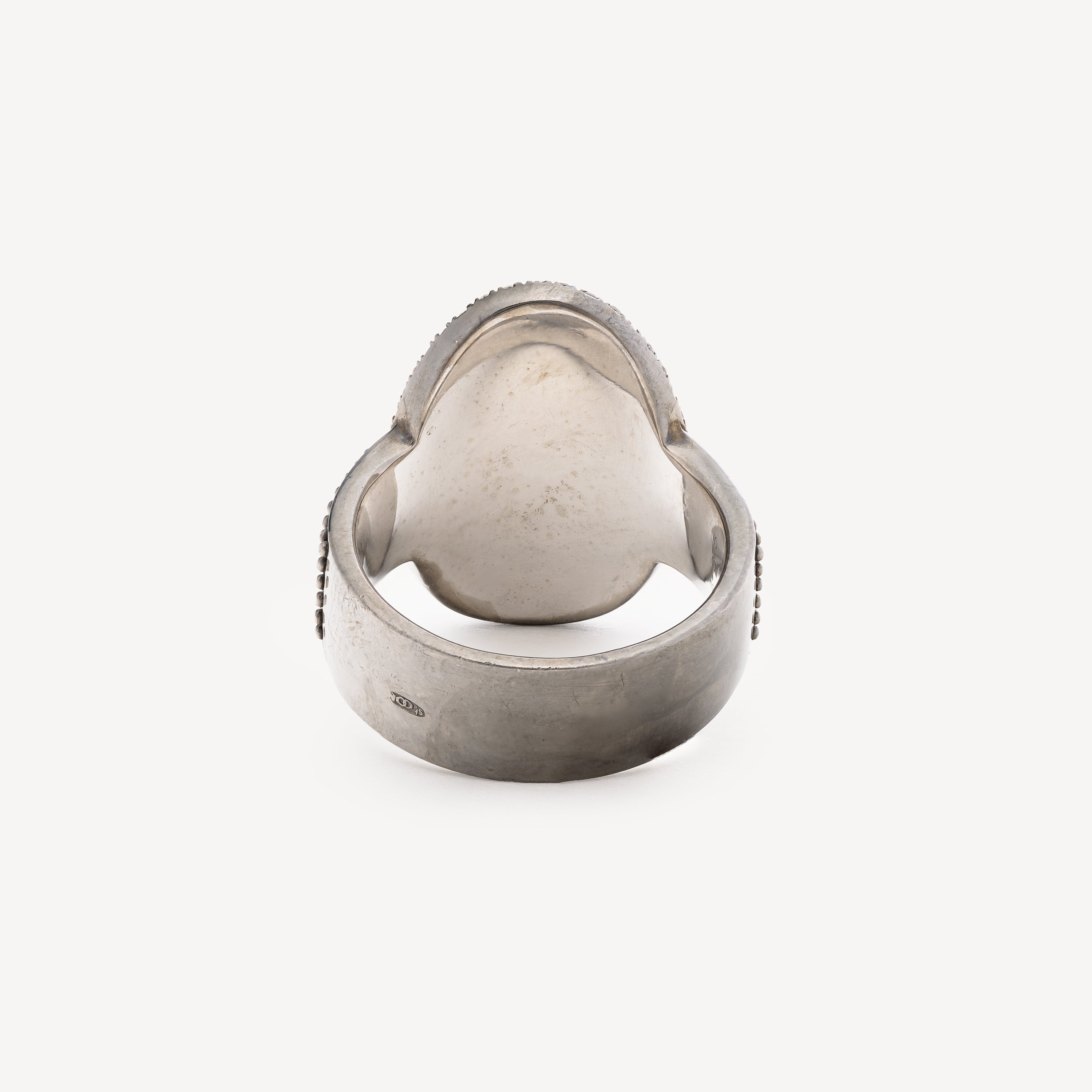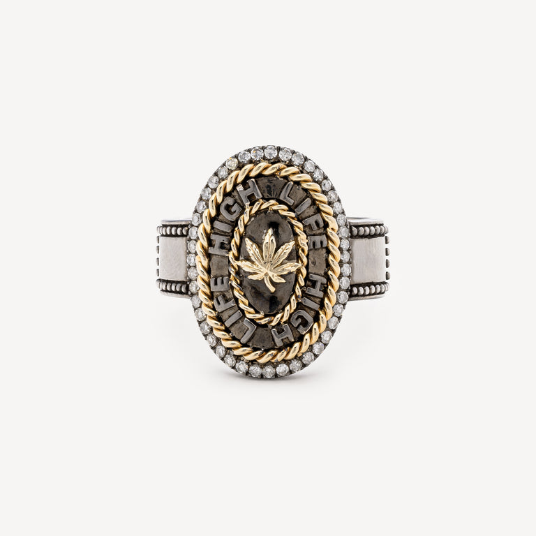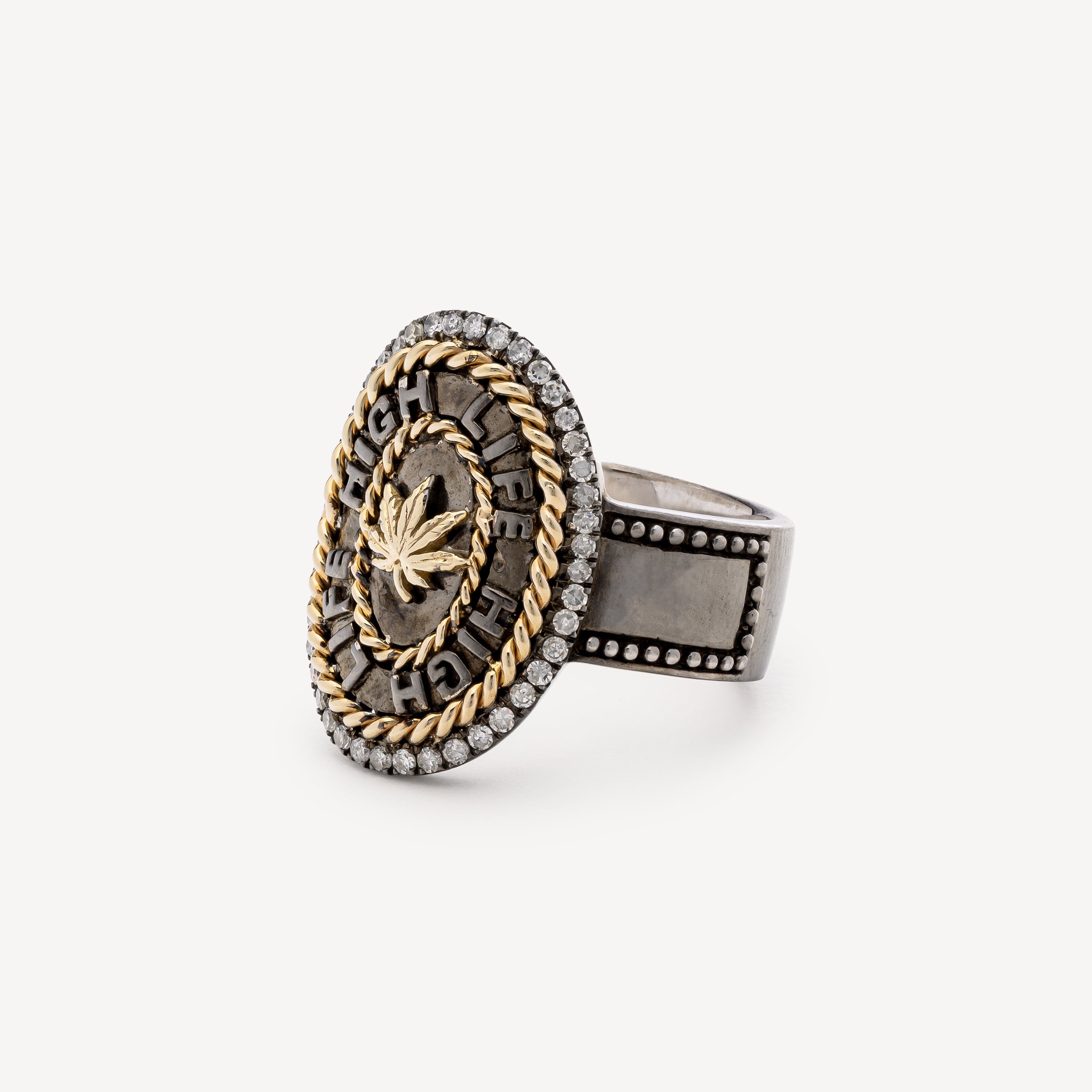 Ring in silver and black rhodium-plated yellow gold with central leaf, “high life” inscriptions and decorated with white diamonds.