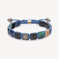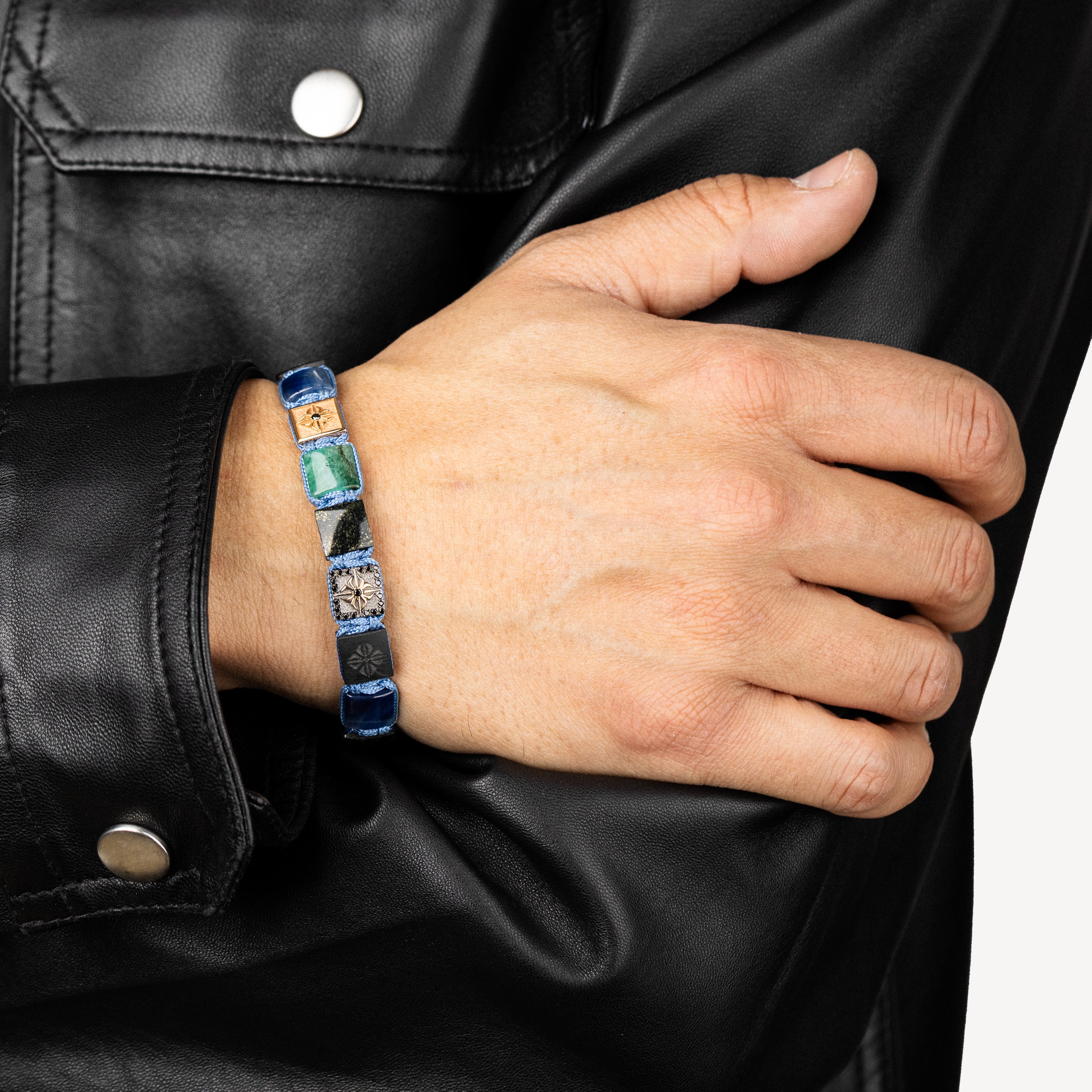 Bracelet monté sur un cordon bleu composé de : 1 lock certificat en or rose et diamant noir, 2 beads 7 mm en rhodium noir plaqué or rose et diamants noirs, 1 lock 10 mm embossé en or rose et diamants noirs, 1 lock 10 mm en rhodium noir plaqué or rose pavé de diamants noirs, 3 lock 10 mm en saphir bleu, 2 lock 10 mm en émeraude, 3 locks 10 mm en jade noire, 4 locks 10 mm en fibre de carbone noir mat.