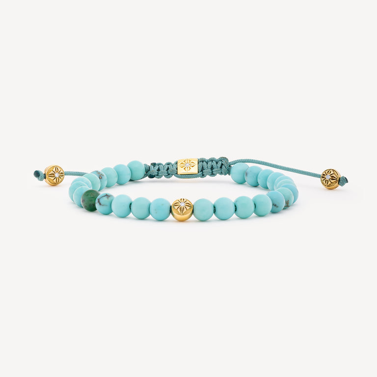 Bracelet mounted on a blue cord composed of 29 beads and a lock: 25 turquoise beads, 3 yellow gold beads set with 2 diamonds, 1 emerald bead, 1 yellow gold lock set with a diamond.