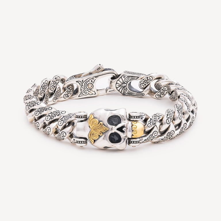 Le bracelet Hydra Vesper en argent et or jaune est façonné avec l’exigence artisanale qui distingue Konstantino, né de la tradition joaillière grecque mêlant histoire et savoir‑faire d’Athènes et de l’île d’Hydra. Le bracelet se pose au poignet avec une présence affirmée, ponctuée au centre d’une tête de mort sculptée, symbole de force et d’intensité mis en valeur par le contraste des métaux et la profondeur des gravures. Chaque détail est travaillé à la main en Grèce, pour une pièce qui sait se faire remarquer sans concession.