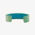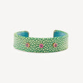 Bracelet jonc en galuchat vert orné de 3 rhodolites. Face intérieure en cuir bleu.