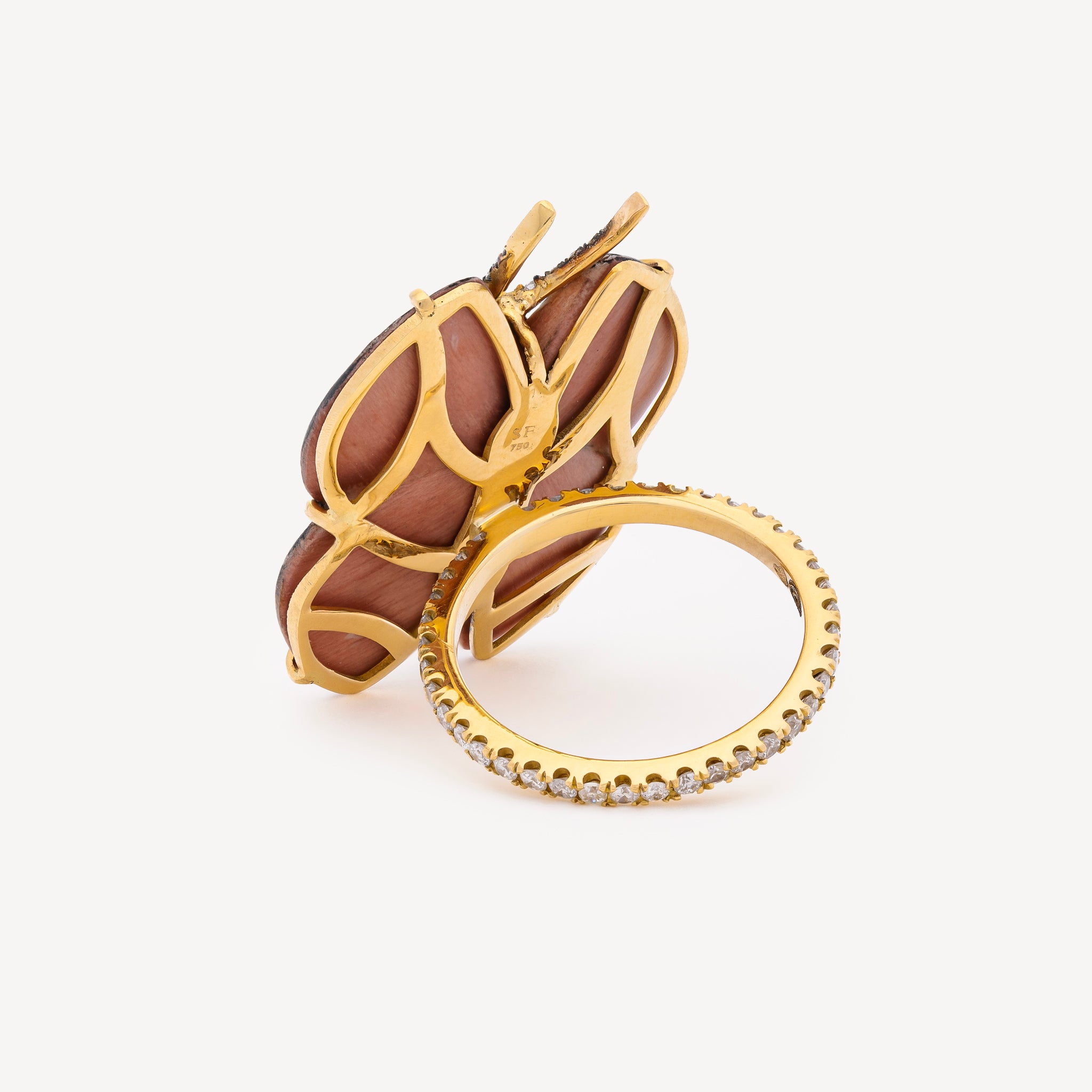 La bague Marquetry Butterfly est sublimée par des ailes peintes aux nuances rosées et noires, évoquant la délicatesse de la nature. Le corps et les antennes, rehaussés de diamants scintillants, ajoutent une touche de lumière et de raffinement. Symbole d’éternité et de lumière, le diamant élève les énergies, renforce la clarté mentale à celui ou celle qui le porte.