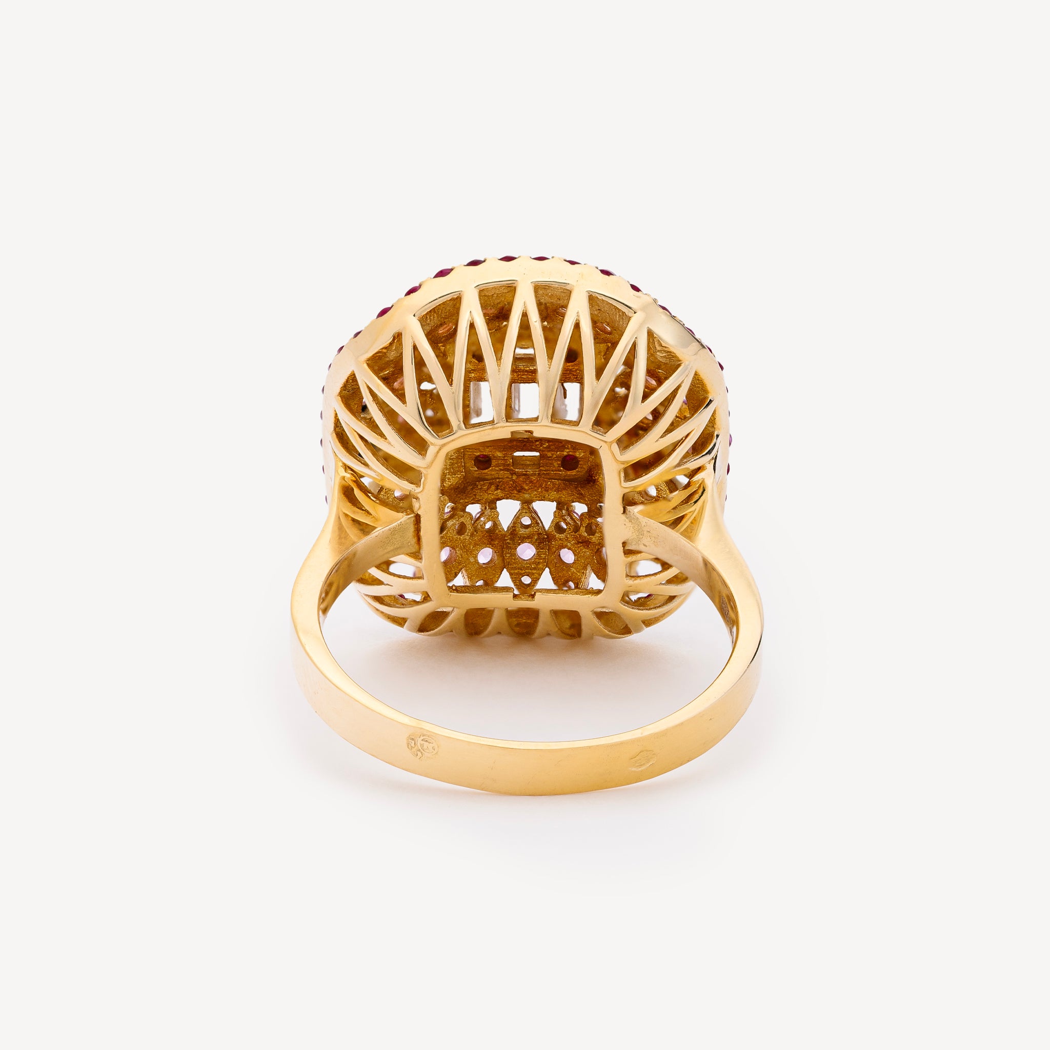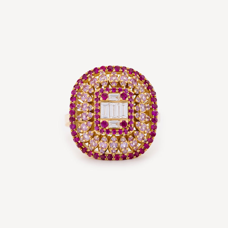 La bague Mirage Cocktail Rose confectionnée en or jaune 18 carats est entièrement pavée de pierres précieuses : un dégradé de saphirs et rubis roses ainsi que des diamants blancs au centre. Le rubis stimule l’énergie du cœur, renforce le courage et inspire l’amour intense, le saphir rose ouvre le cœur et nourrit l’harmonie émotionnelle tandis que le diamant blanc incarne la pureté et la force intérieure.