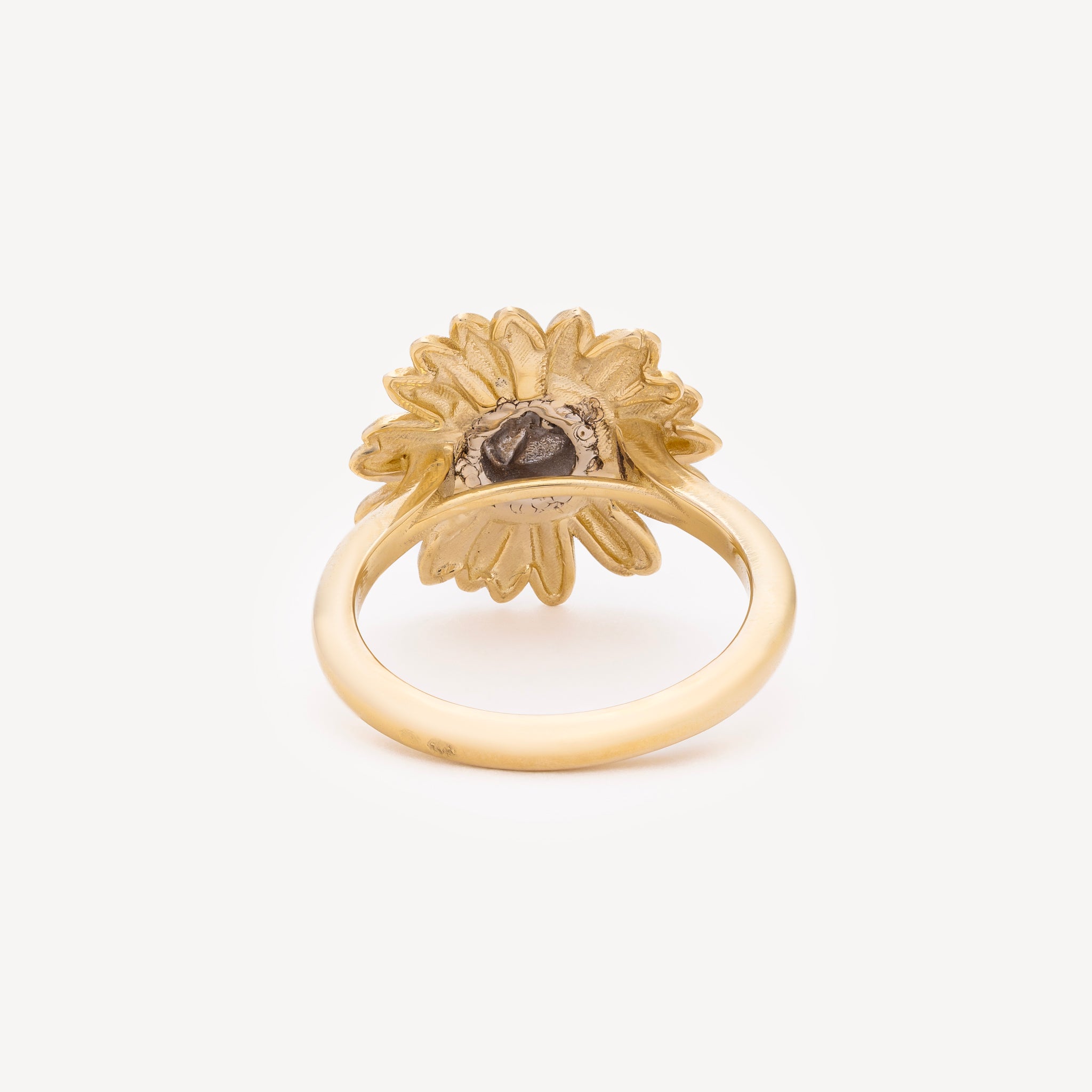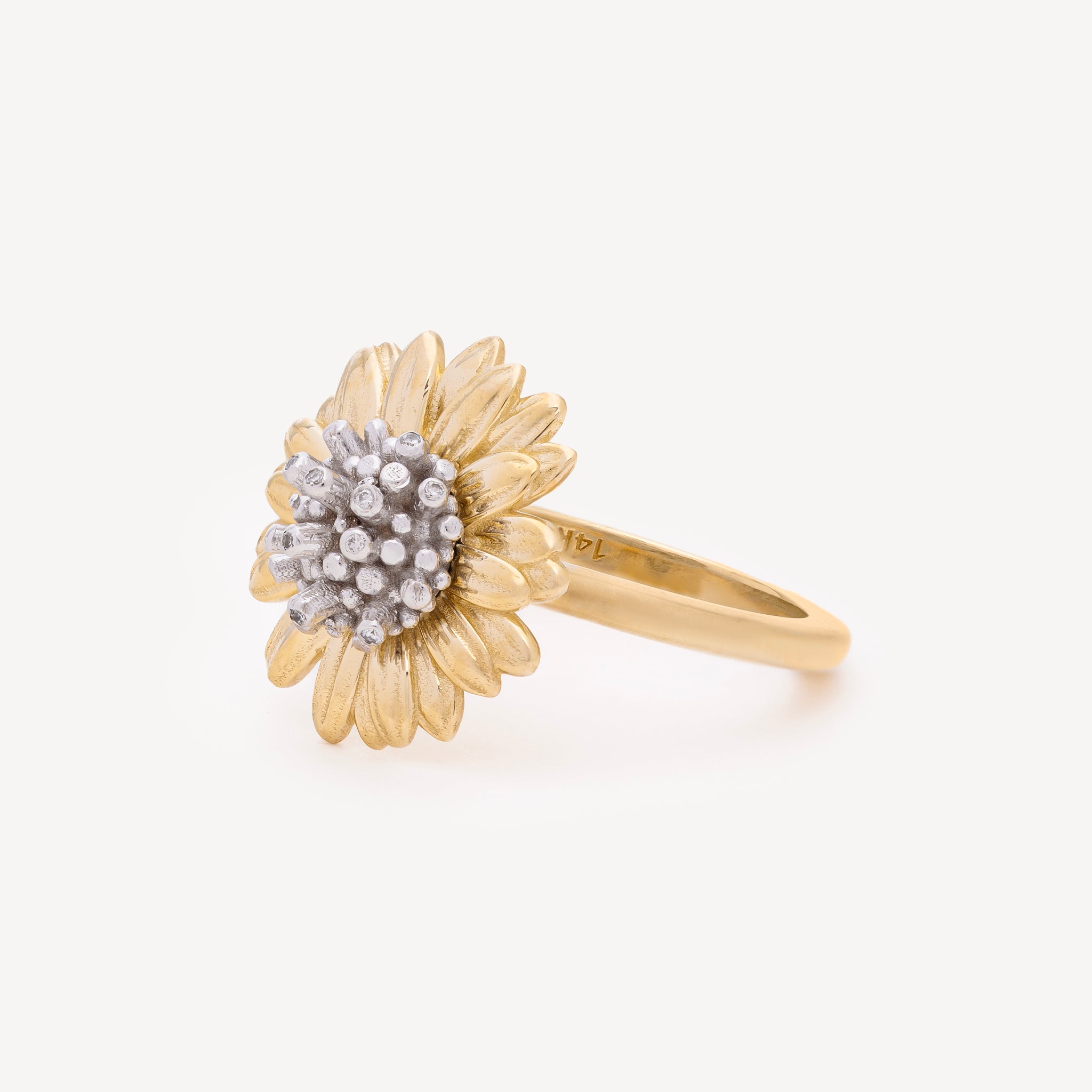 La bague Sunflower, fraîchement inspirée par la beauté des tournesols, est confectionnée en or jaune et présente un bouquet de diamants au centre. Pierre de pureté et d’énergie, le diamant blanc aide à équilibrer les émotions et à purifier l’aura.