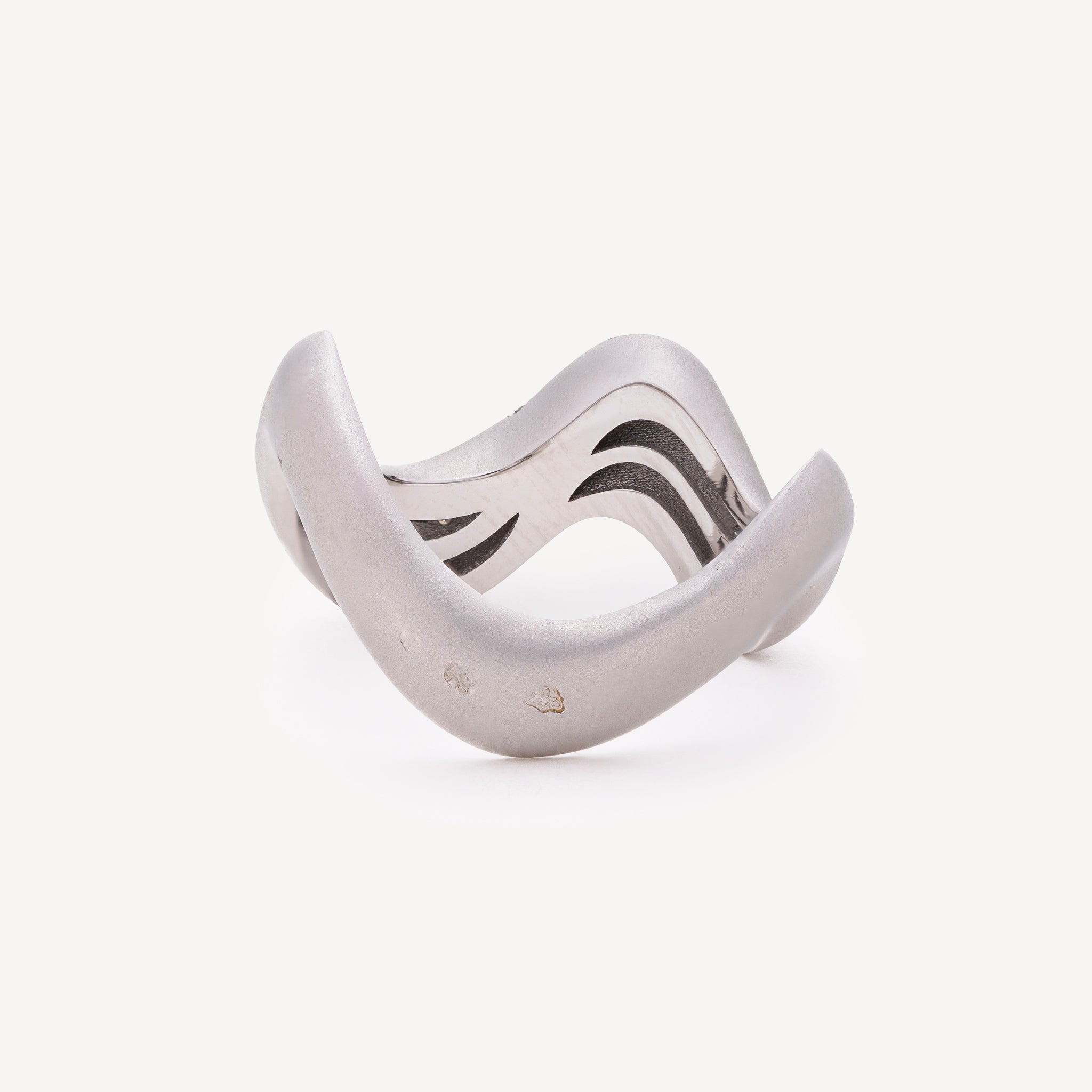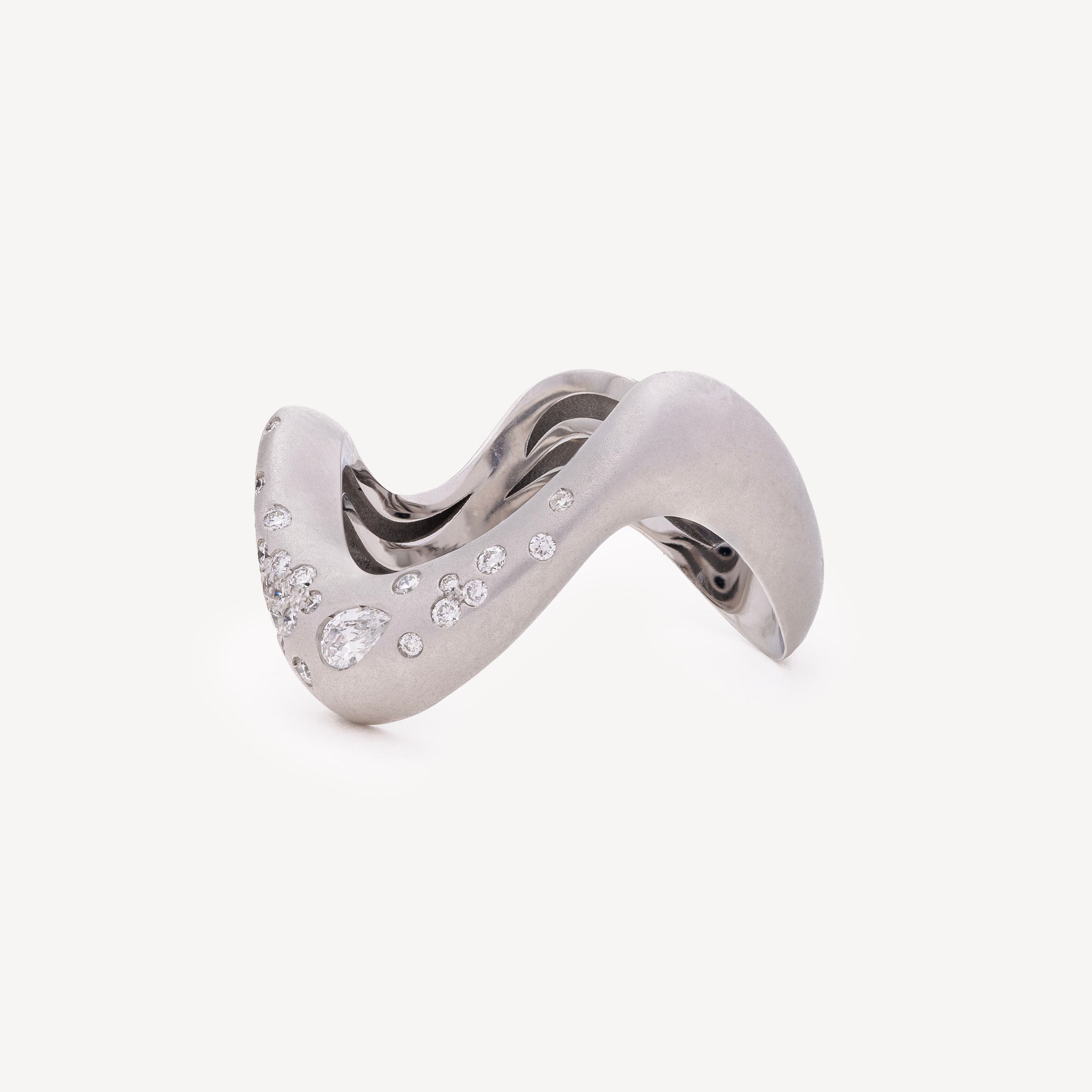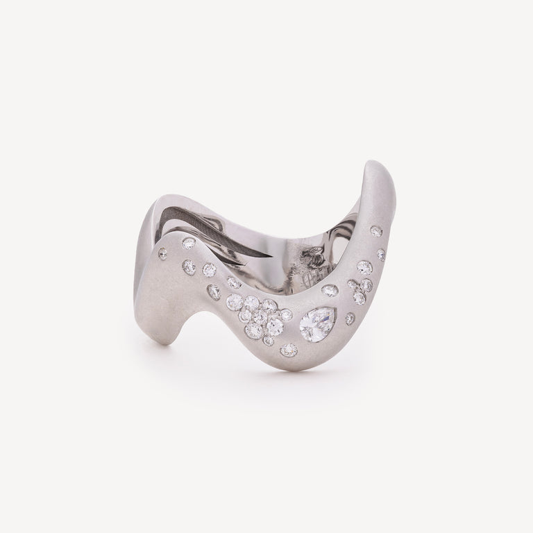 Sculptée dans de l’or blanc poli 18 carats, la bague Swoon II séduit par sa forme fluide et organique. Une éclaboussure rayonnante de diamants blancs ronds coule gracieusement sur sa surface, mise en valeur par un diamant central taille marquise.
