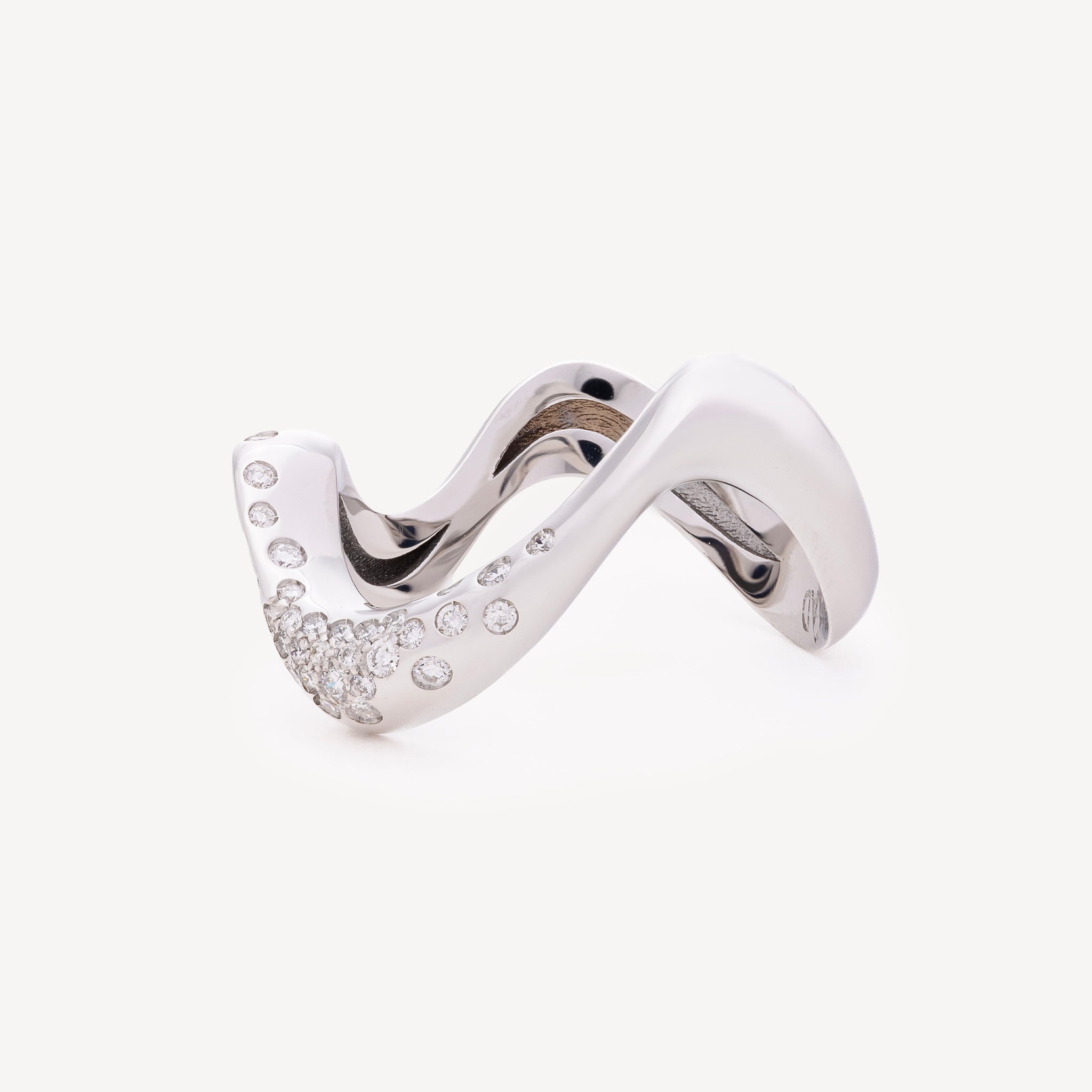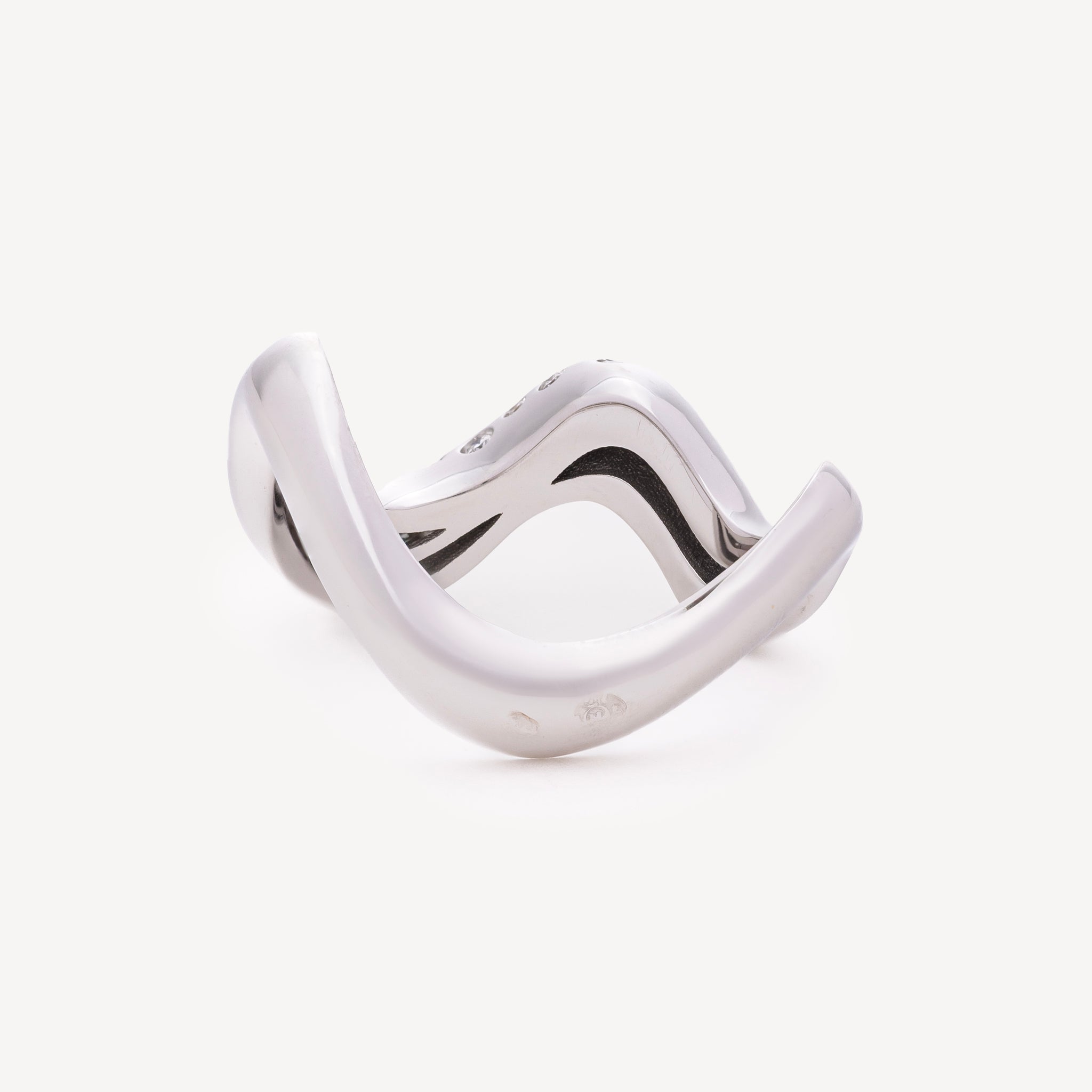 Confectionnée en or blanc brossé 18 carats, la bague Swoon incarne la fluidité et la grâce. Son design sculptural, rehaussé de délicats diamants ronds, crée un jeu captivant de textures et de brillance.