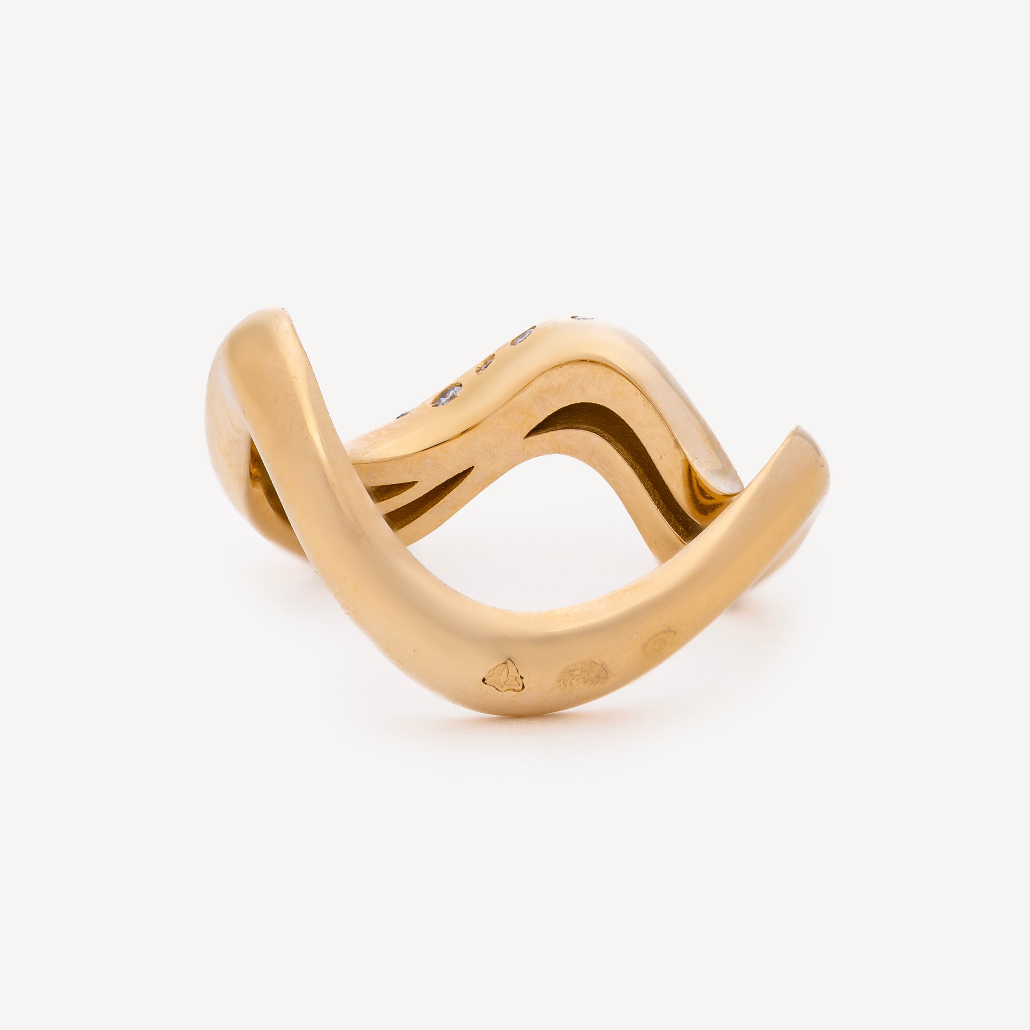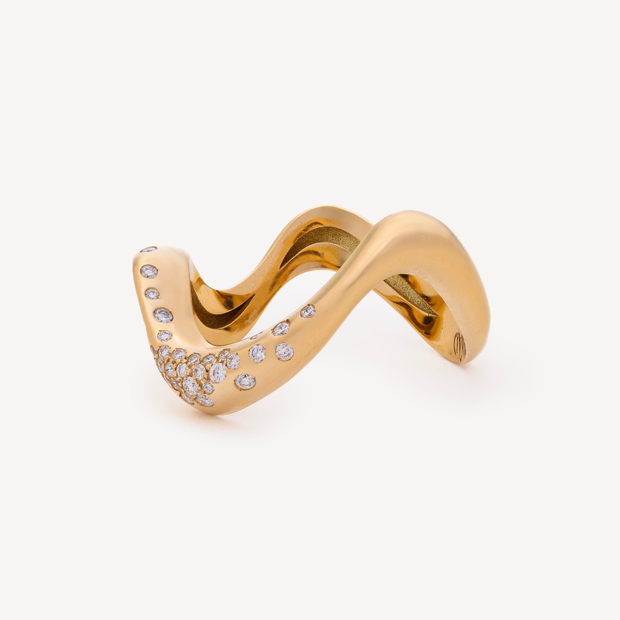 Magnifiquement confectionnée en or jaune brossé 18 carats, la bague Swoon incarne la fluidité et la grâce. Son design sculptural, rehaussé de délicats diamants ronds, crée un jeu captivant de textures et de brillance.