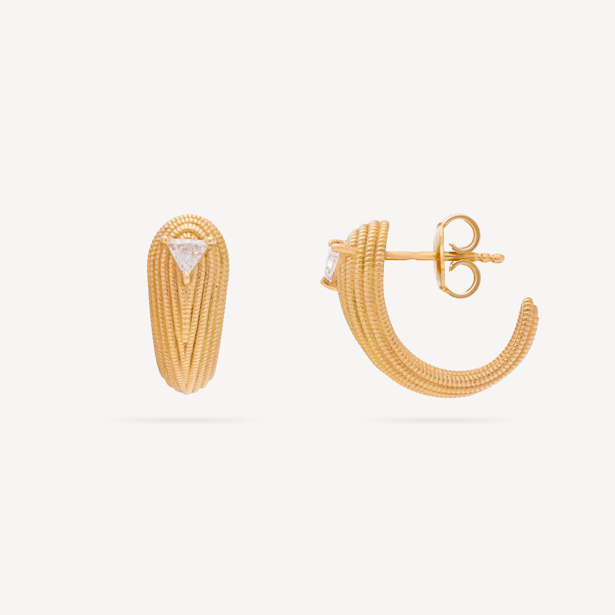 Les boucles d’oreilles Écaille viennent se poser sur votre lobe comme une coquille d’or mat ornée d’écailles et surmontée d'un diamant étincelant à la forme triangulaire. Symbole d’éternité et de lumière, le diamant élève les énergies, renforce la clarté mentale à celui ou celle qui le porte.