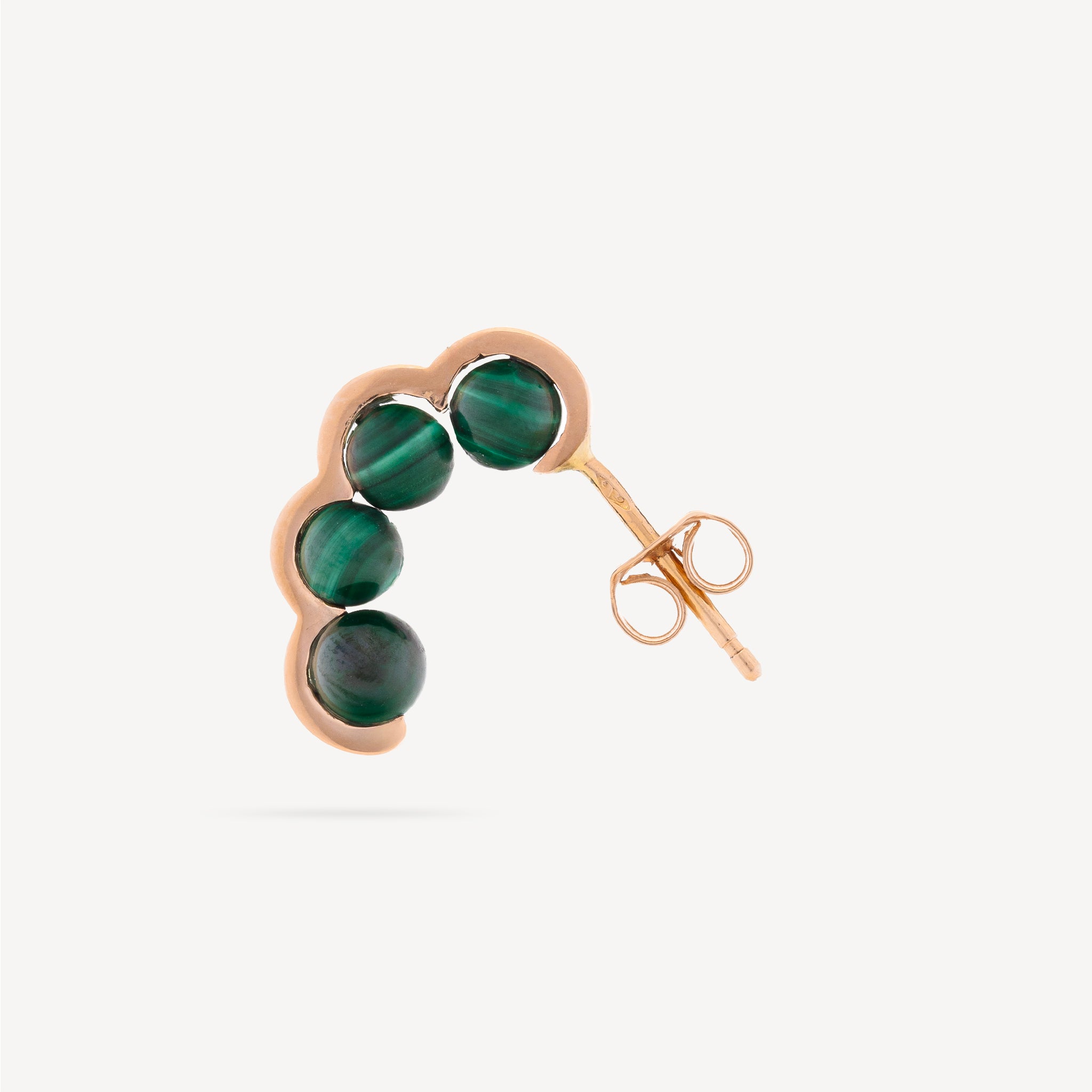 Cette boucle d'oreille puce en or rose 18 carats est délicatement ornée de plusieurs perles malachites, créant un jeu de lumière subtil et raffiné. Pierre de transformation par excellence, la malachite absorbe les énergies négatives, libère les blocages émotionnels et encourage le renouveau, la confiance et l’équilibre intérieur.