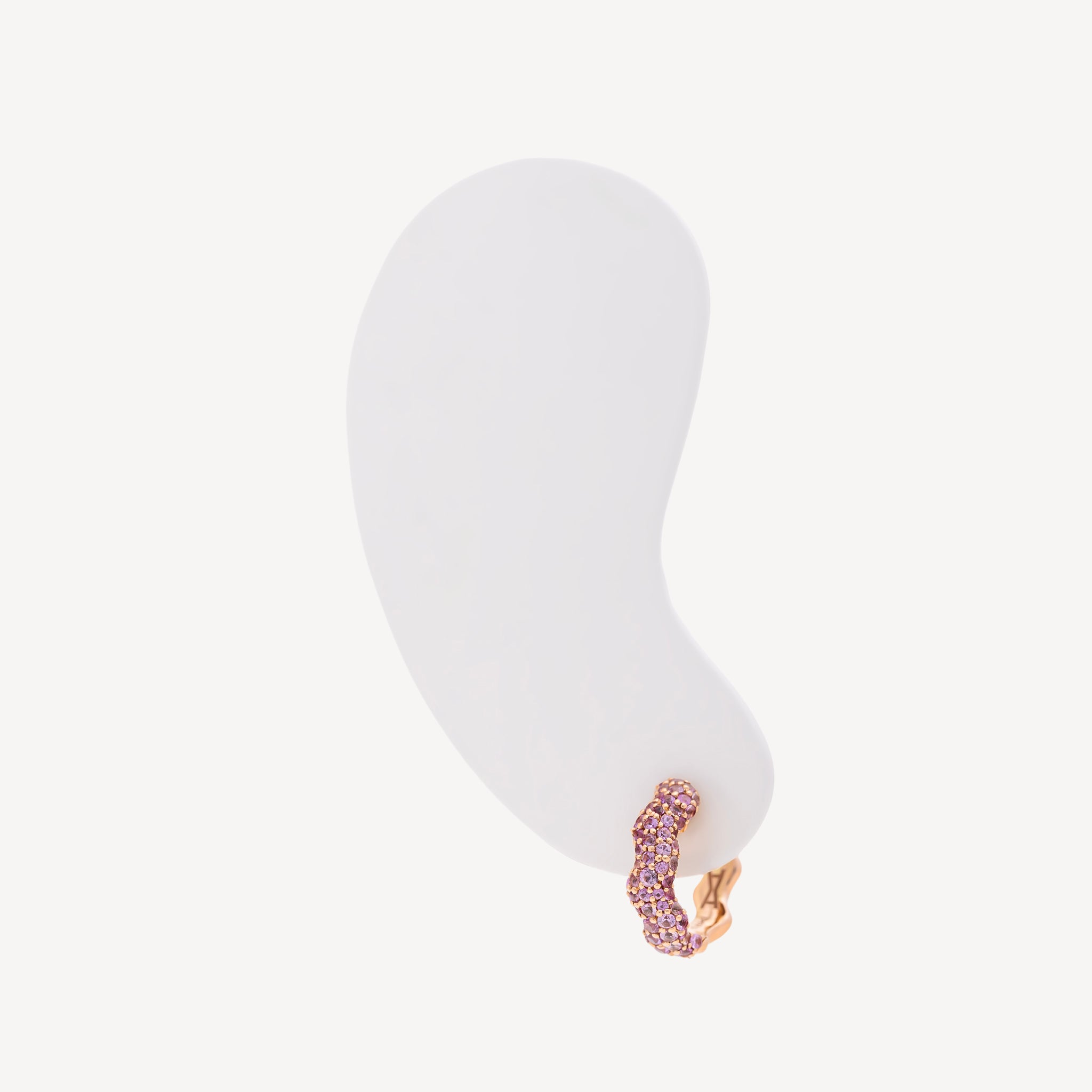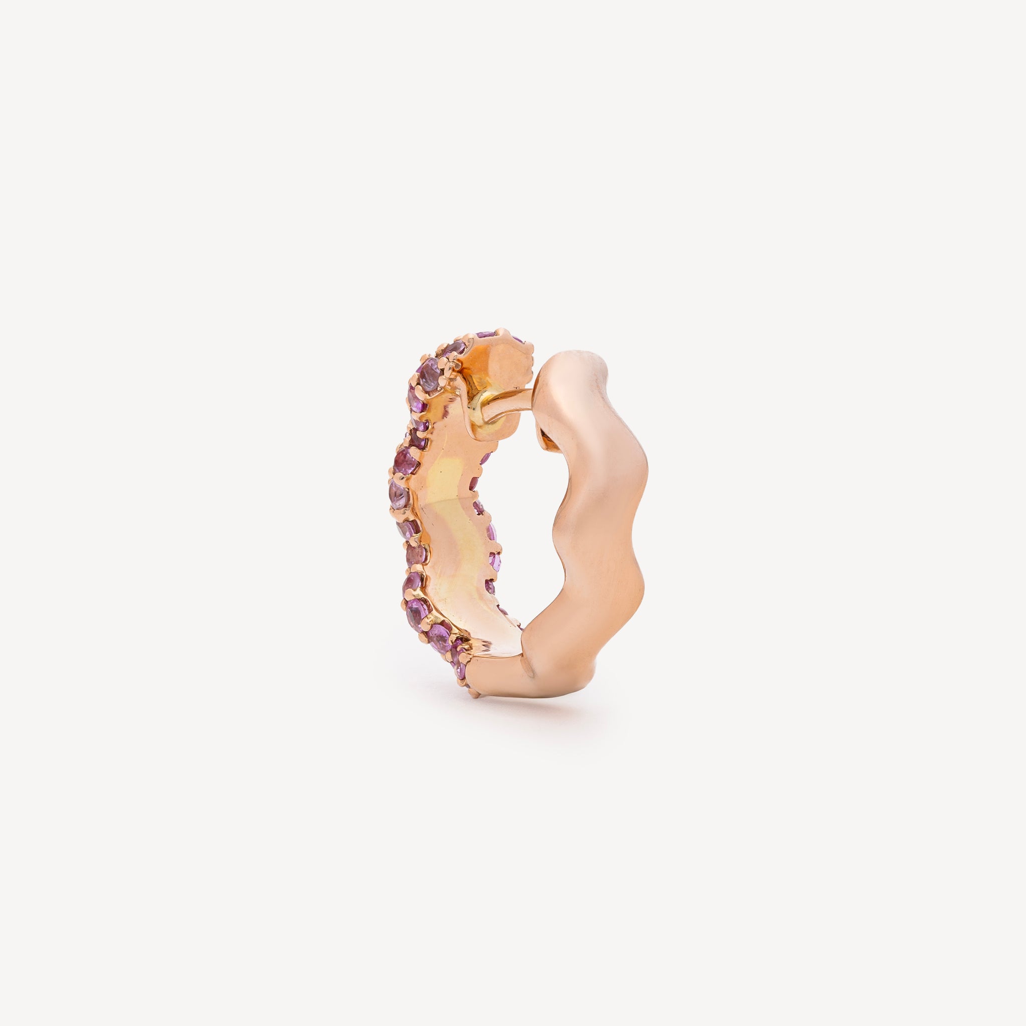 Cette créole est confectionnée en or rose 18 carats et pavées de saphirs roses. À la fois nostalgique et raffinée, cette créole est une ode à l’impermanence.