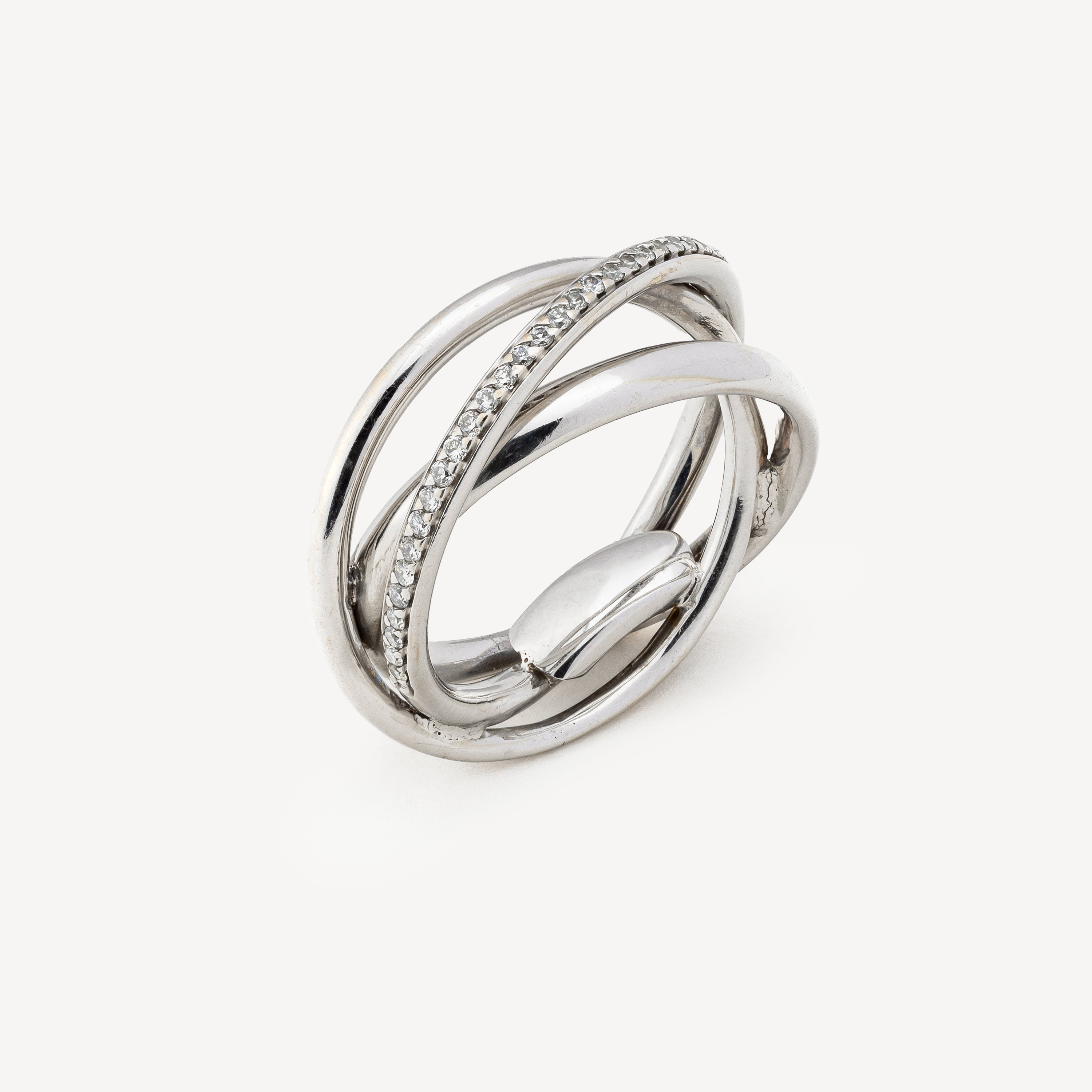 Bague trois anneaux entrelacés en or blanc sertie de diamants blancs.