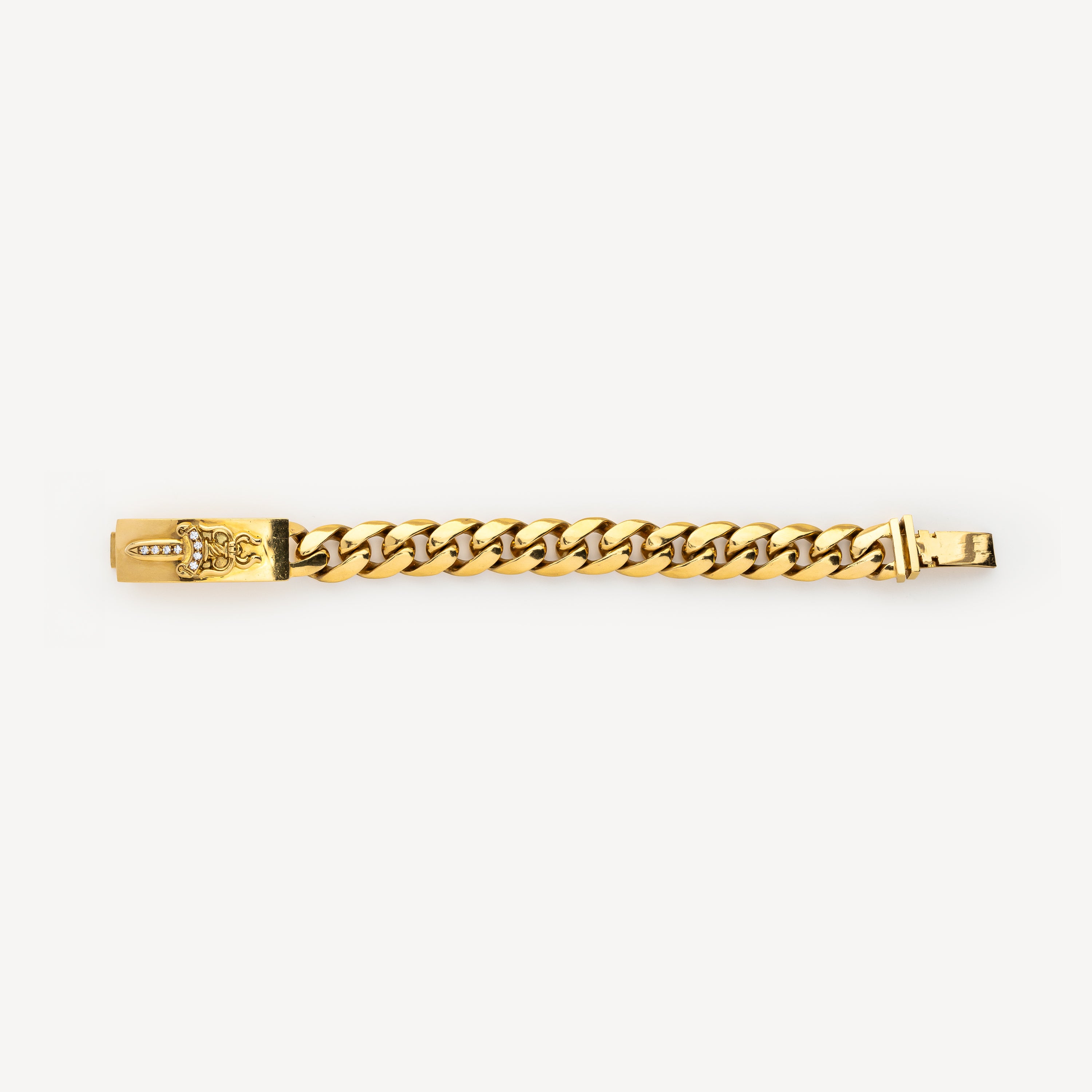Bracelet chaîne en or jaune avec grand fermoir croix ornée de diamants blancs.