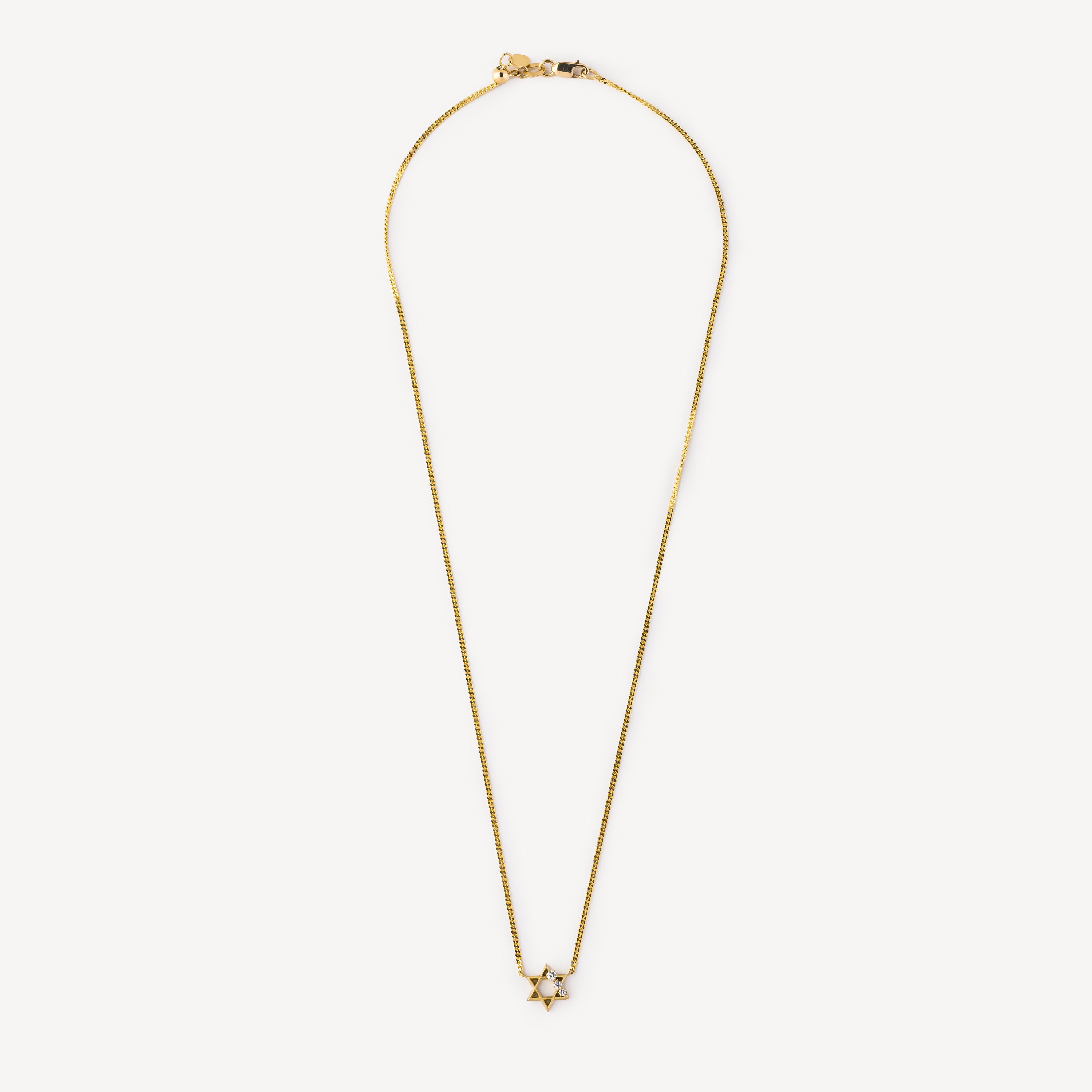 Fabriquée à la main en or 18 carats, la chaîne en maille curb présente 0,08ct de diamants ronds brillants. Le pendentif Étoile de David est une pièce délicate et facile à porter. Sa chaîne à billes ajustable permet de porter ce collier fin à une longueur maximale de 46 cm, offrant ainsi une grande polyvalence.