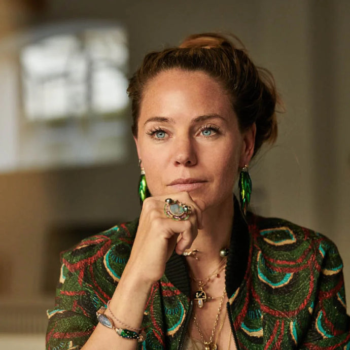 Bibi van der Velden -Schmuck wird aus edlen und kostbaren Materialien wie 18-karätigem Gold, aus fairem Handel, Diamanten und Barockperlen hergestellt. Bibi glaubt, dass Schmuck seinem Träger Energie verleihen sollte. Ihre Stücke bieten eine verspielte, persönliche und sehr künstlerische Vision von edlem Schmuck.