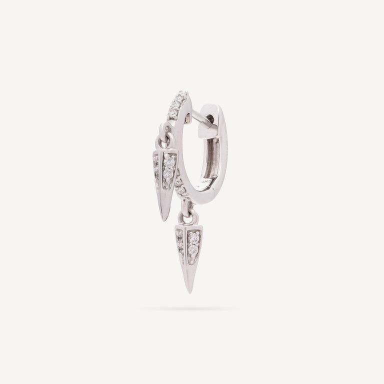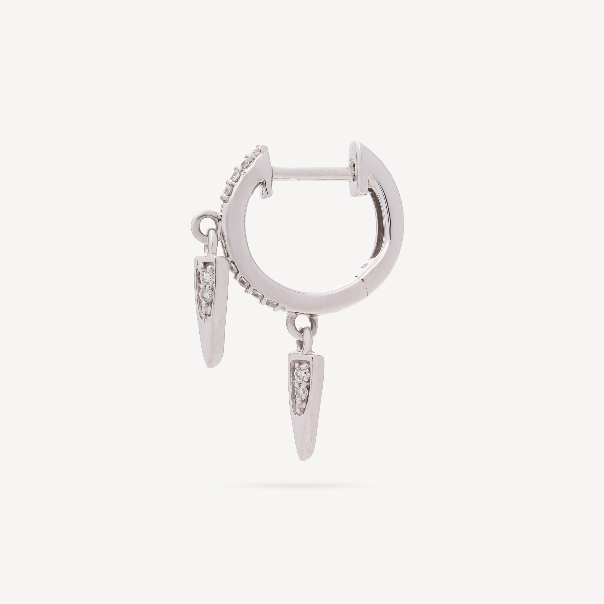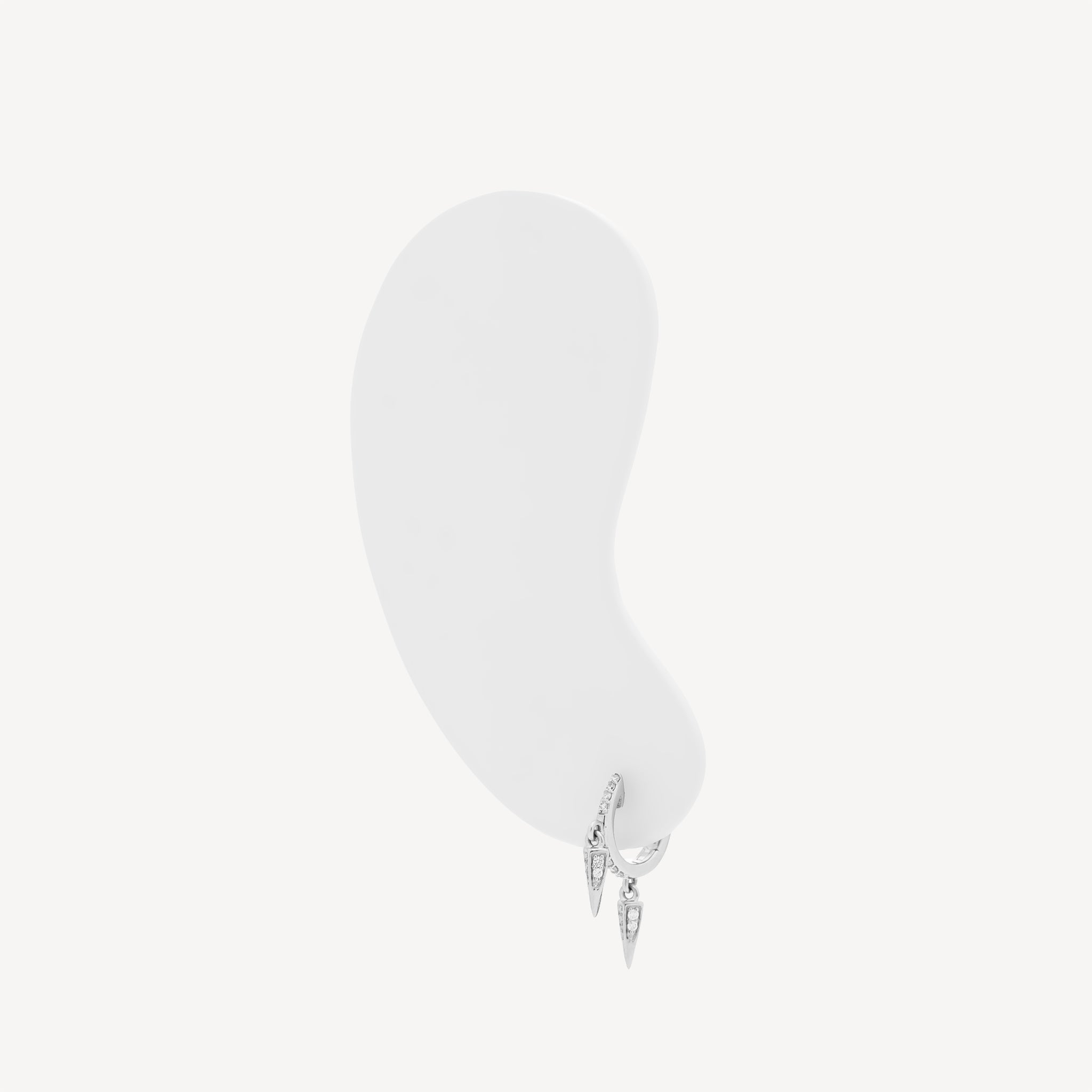 La créole Auré est confectionnée en or blanc 14 carats et dispose de deux pendants en forme de pics, tout deux, ornés de diamants. Symbole d’éternité et de lumière, le diamant élève les énergies, renforce la clarté mentale, la force intérieure et apporte équilibre et pureté à celui ou celle qui le porte.