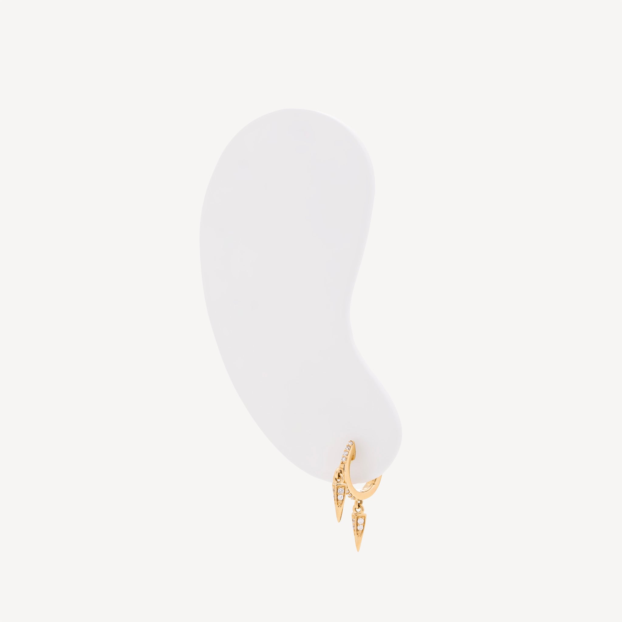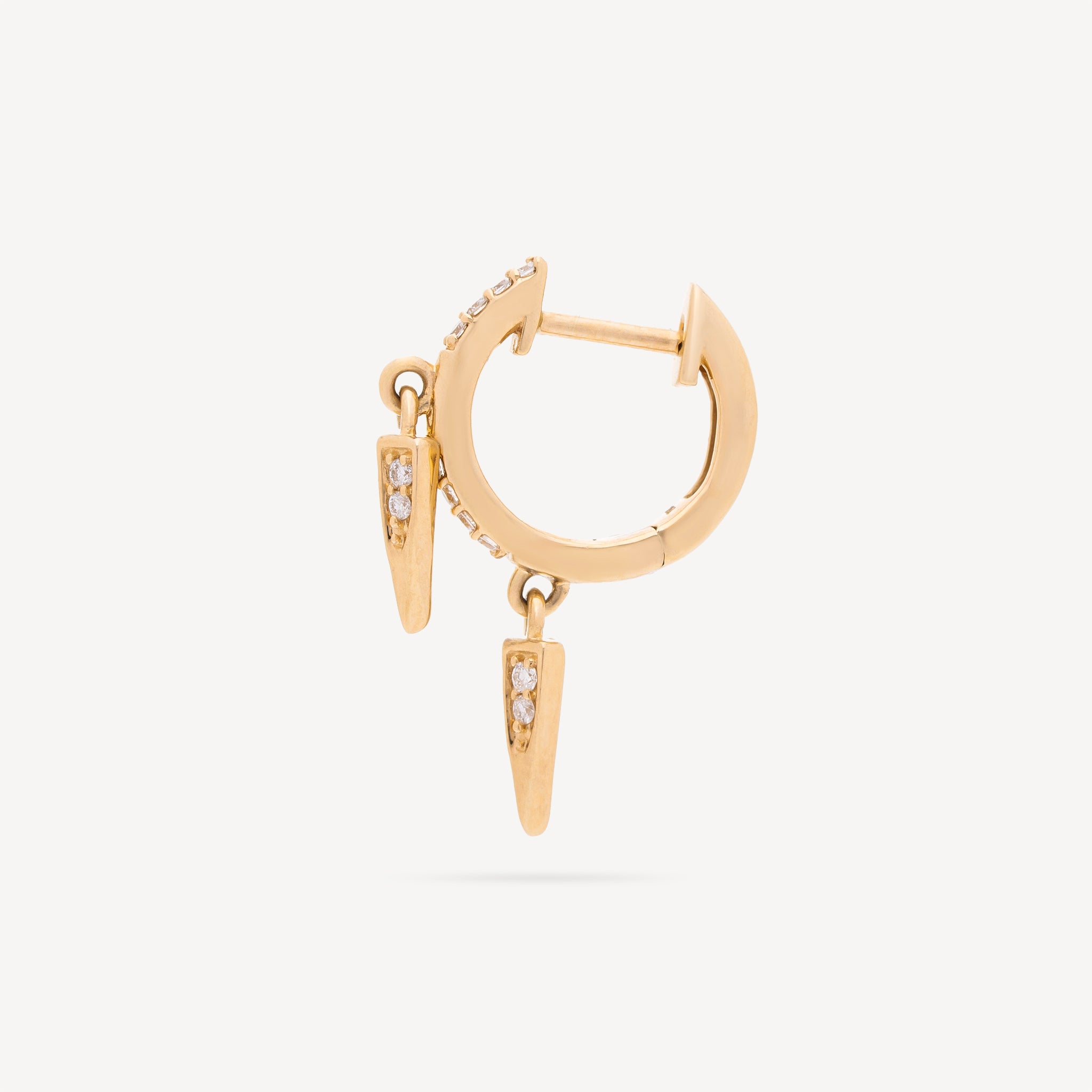 La créole Auré est confectionnée en or jaune 14 carats et dispose de deux pendants en forme de pics, tout deux, ornés de diamants. Symbole d’éternité et de lumière, le diamant élève les énergies, renforce la clarté mentale, la force intérieure et apporte équilibre et pureté à celui ou celle qui le porte.