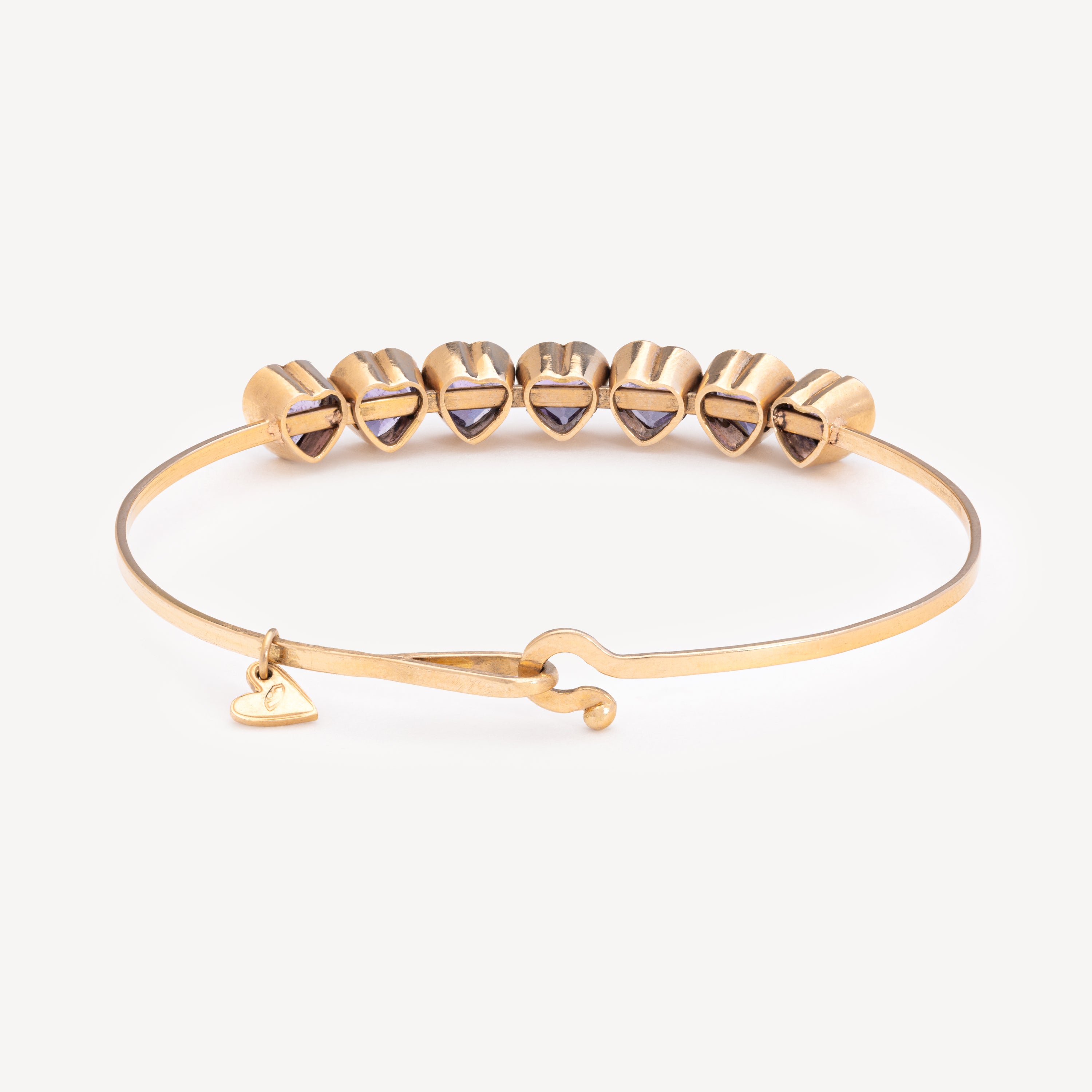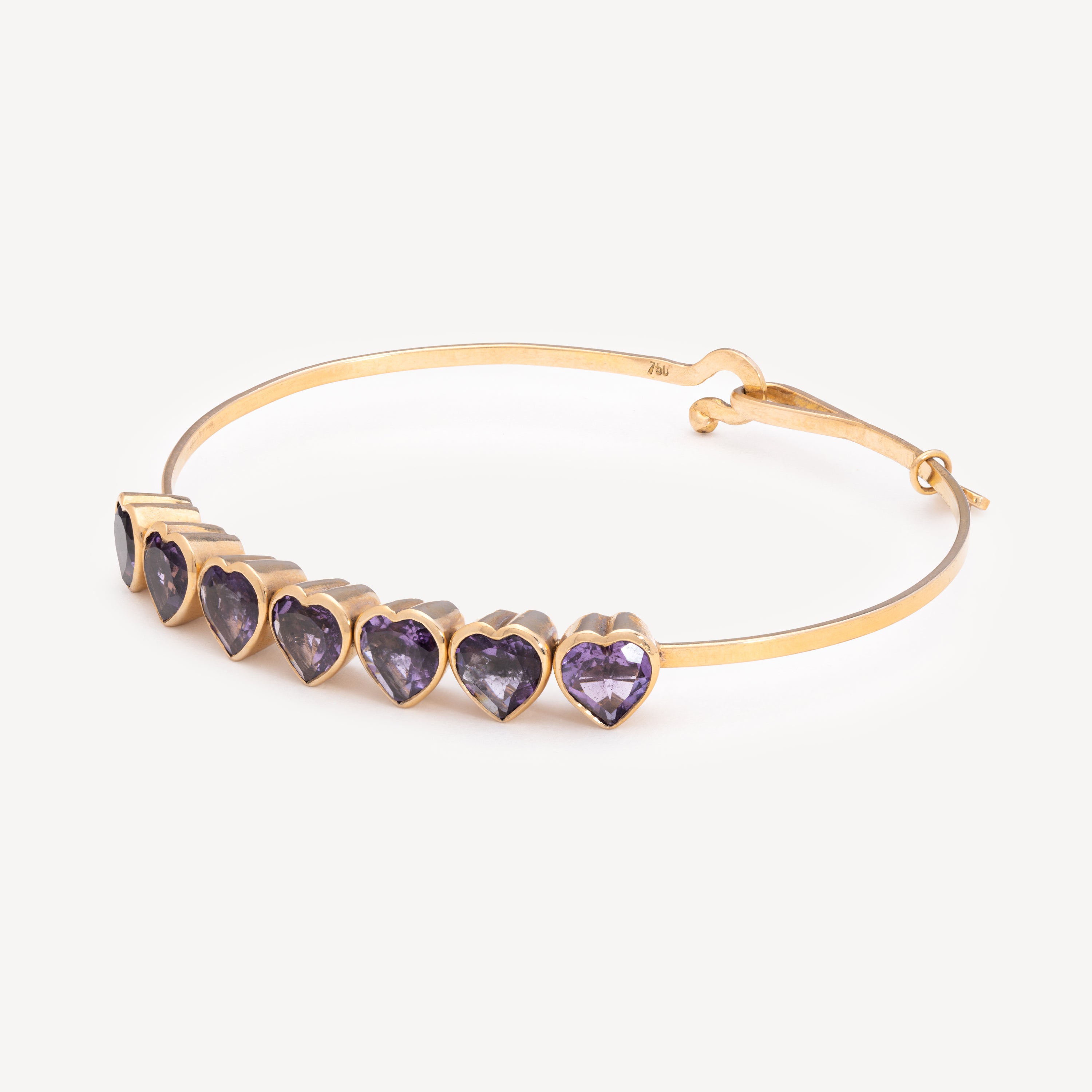 Ce merveilleux bracelet en or jaune 18 carats est agrémenté d'une lignée de cœurs en améthyste. Ingénieusement conçu, ce jonc unique permet aux pierres de bouger légèrement, ajoutant une touche à la fois ludique et élégante à cette pièce.