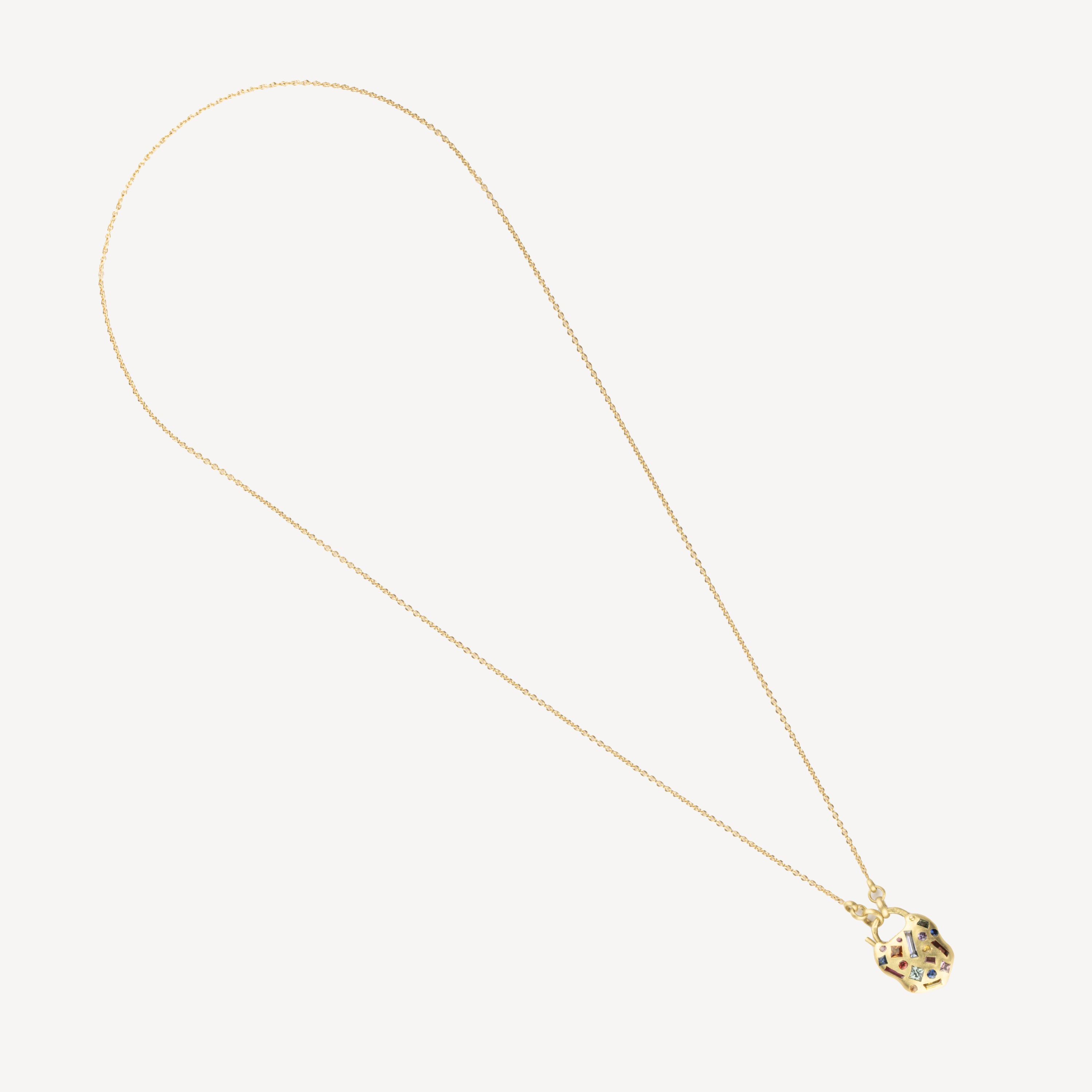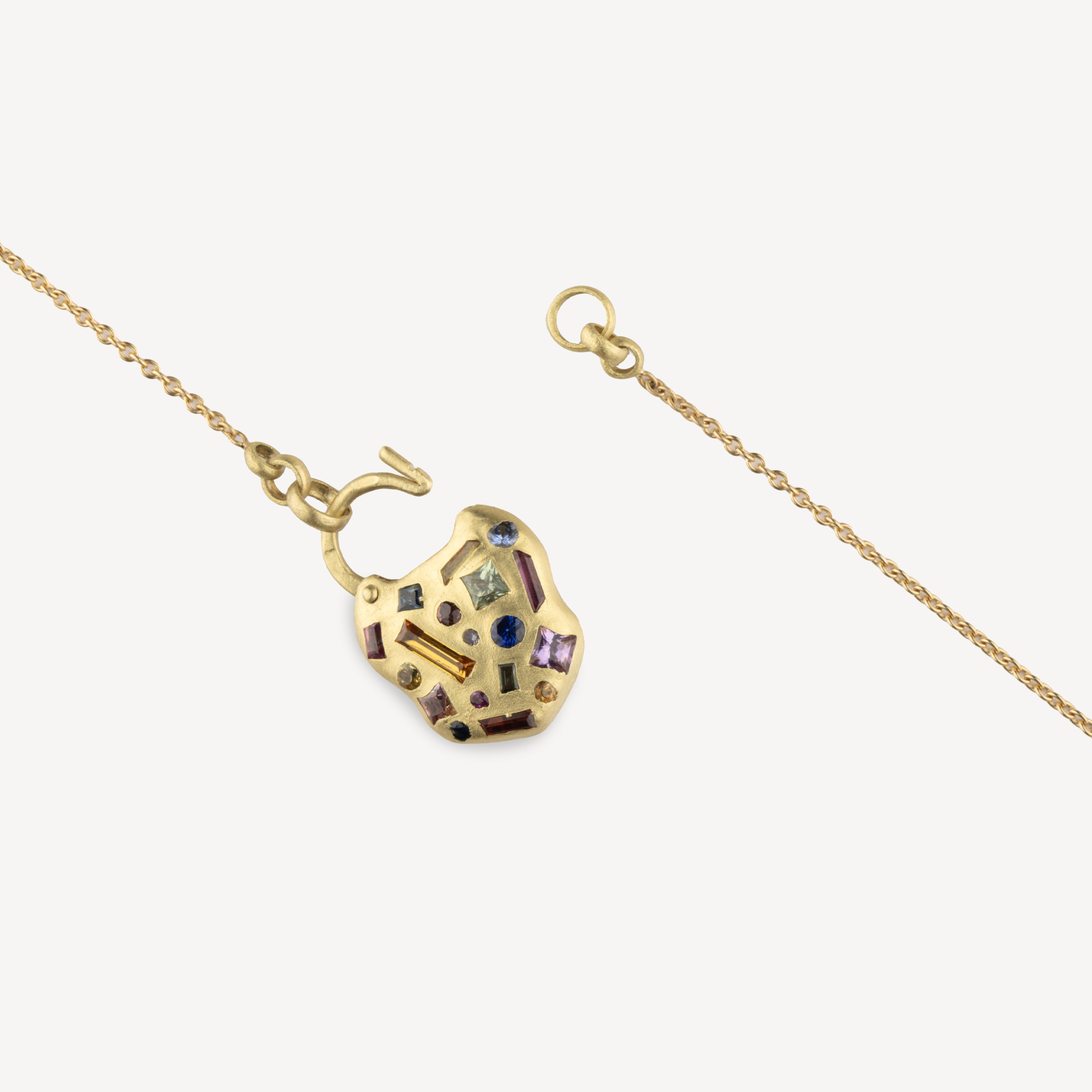 Diese Halskette verkörpert dezente und luxuriöse Eleganz durch die zarte Kombination von Saphiren mit den schimmernden Farbtönen eines Regenbogens. Diese Steine mit fachmännisch integrierten Mischschliffen erwachen in einem doppelseitigen Vorhängeschloss-Anhänger zum Leben. Sein aktiver Scharnierverschluss verleiht diesem Schmuckstück, das anmutig an einer Kabelkette aus 18 Karat recyceltem Gelbgold hängt, eine moderne und praktische Note. Dieses raffinierte Stück verbindet nahtlos luxuriöse Exklusivität mit warmer Zugänglichkeit und verleiht Ihrem Stil faszinierende Eleganz.