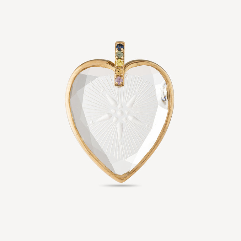 Gabin-Herzanhänger aus Gelbgold und Kristall mit mehrfarbigen Saphiren. Kristall an der Herzseite leicht beschädigt.