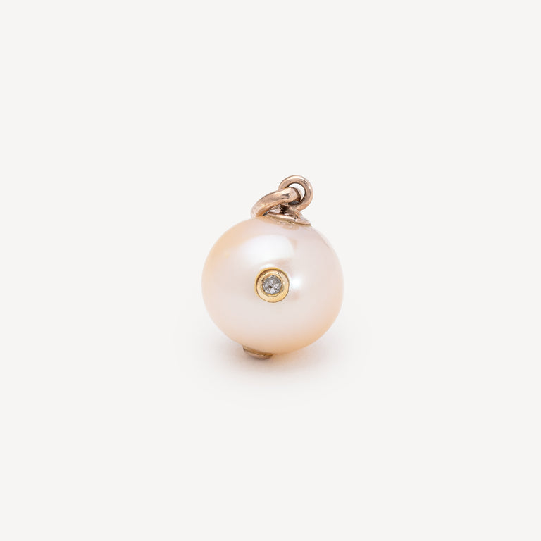 Pendentif perle en or rose avec diamant blanc central. Peut aussi être porté en charm de bracelet ou boucle d’oreille. Présence de petites cernes sur la perle.