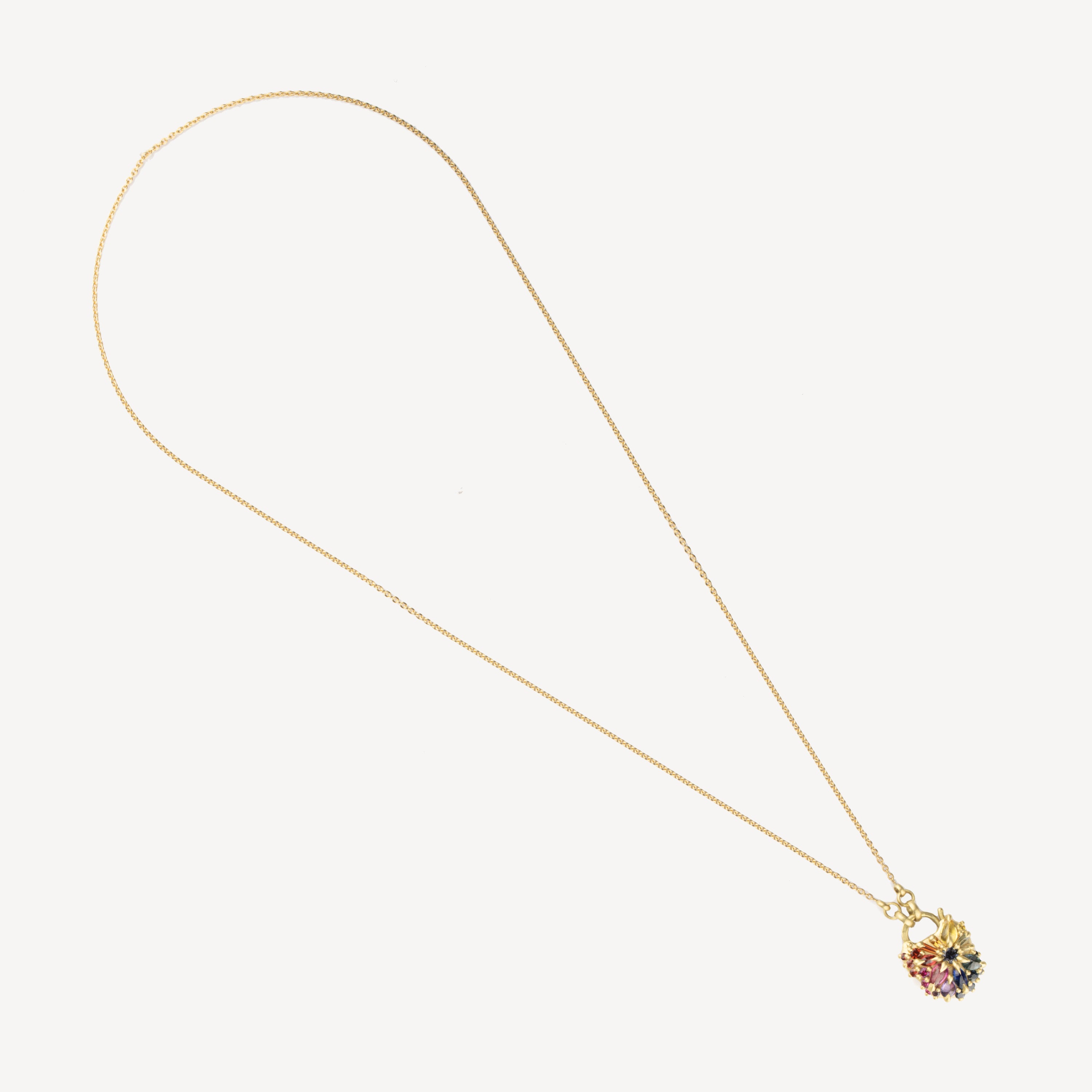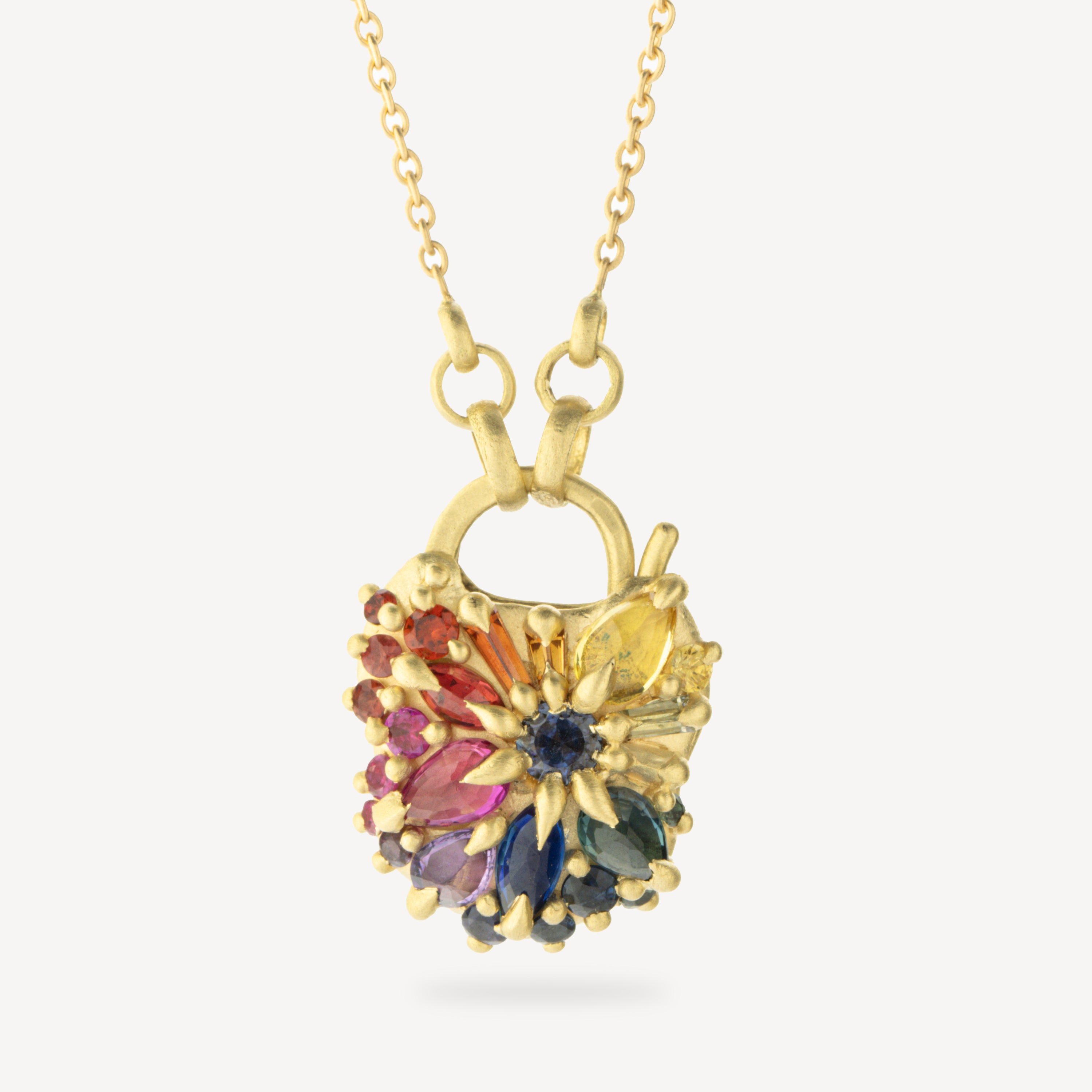 Entdecken Sie die faszinierende Brillanz von Regenbogen-Saphiren in verschiedenen Schliffen, sorgfältig verpackt in einem zarten kleinen Vorhängeschloss. Dieses Juwel, ein echter Schatz, verfügt über einen dynamischen Scharnierverschluss, der ein raffiniertes und raffiniertes Design offenbart. Zusammen mit einer Kabelkette aus 18-karätigem recyceltem Gelbgold verkörpert dieses Stück die perfekte Harmonie zwischen raffiniertem Luxus und einer freundlichen, zugänglichen Note. Tauchen Sie ein in eine Welt, in der die Brillanz von Edelsteinen mit der Noblesse von Metall verschmilzt und Ihnen ein unvergleichliches Erlebnis bietet.