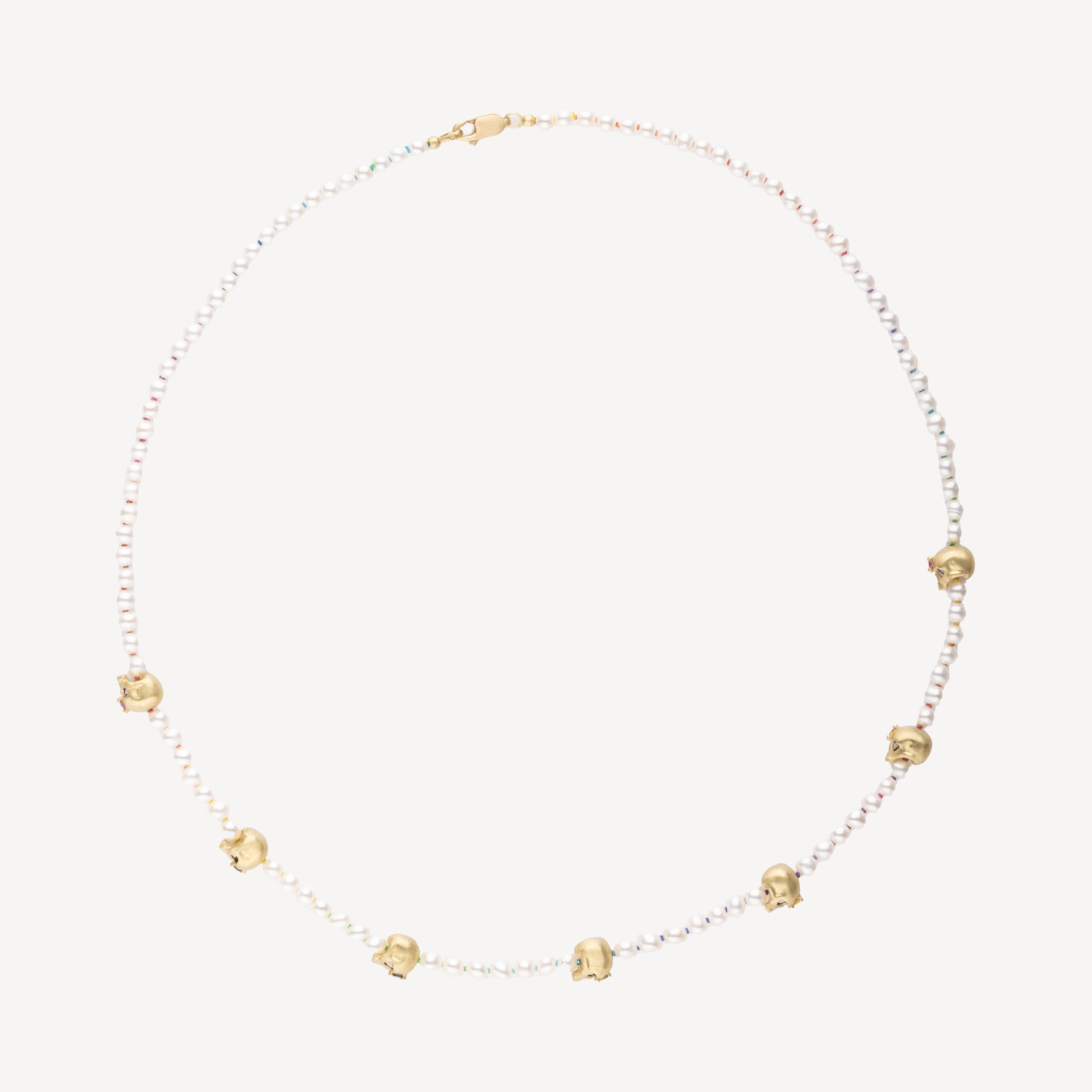 Entdecken Sie den exquisiten, kühnen und respektlosen Ausdruck dieser Halskette: Die ikonischen PW-Totenköpfe aus 18-karätigem recyceltem Gold, verziert mit zarten Regenbogen-Saphiren und sorgfältig am dritten Auge positioniert, werden zart von Perlen aus weißen AA-Süßwasserperlen von 3,5 mm umrahmt. Diese einzigartigen Stücke werden sorgfältig auf Regenbogendraht mit Karabinerverschluss montiert und schaffen so eine künstlerische Verbindung aus Luxus und Originalität für einen Hauch verspielter Eleganz.