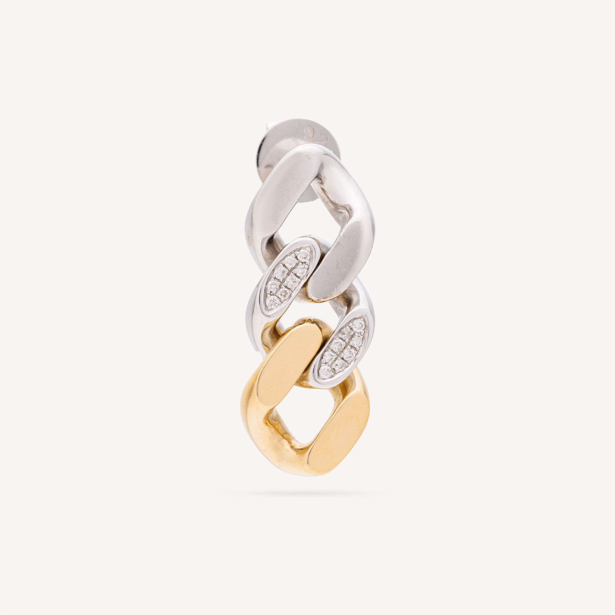 Cette boucle d’oreille Link de Rainbow K en or jaune 14 carats et argent est sertie de diamants blancs. Elle incarne l’élégance audacieuse de la maison, jouant sur les lignes graphiques du motif link associées à l’éclat discret des diamants.