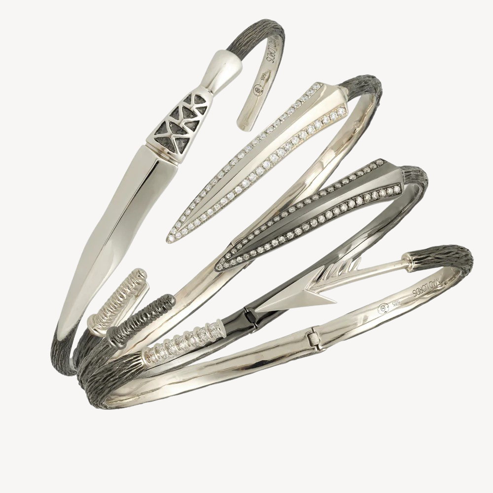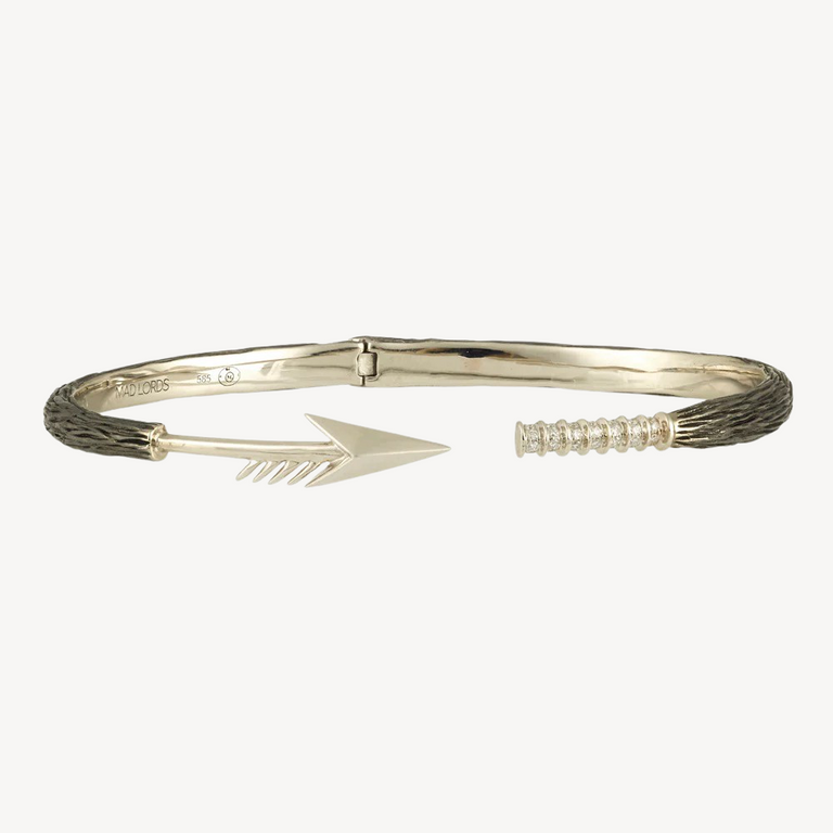 Dieses Armband ist ausschließlich aus Weißgold gefertigt. Sein Ende ist mit weißen Diamanten besetzt. Dieser Pfeil, der den Sinn des Lebens symbolisiert, ist von inzwischen verschwundenen Kulturen inspiriert. Die Verbindung zwischen der Reinheit der Spitze und der Patina des Griffs verleiht dem Schmuck einen markanten Kontrast. Es ist auch in Schwarz, Gelb oder Roségold erhältlich.
