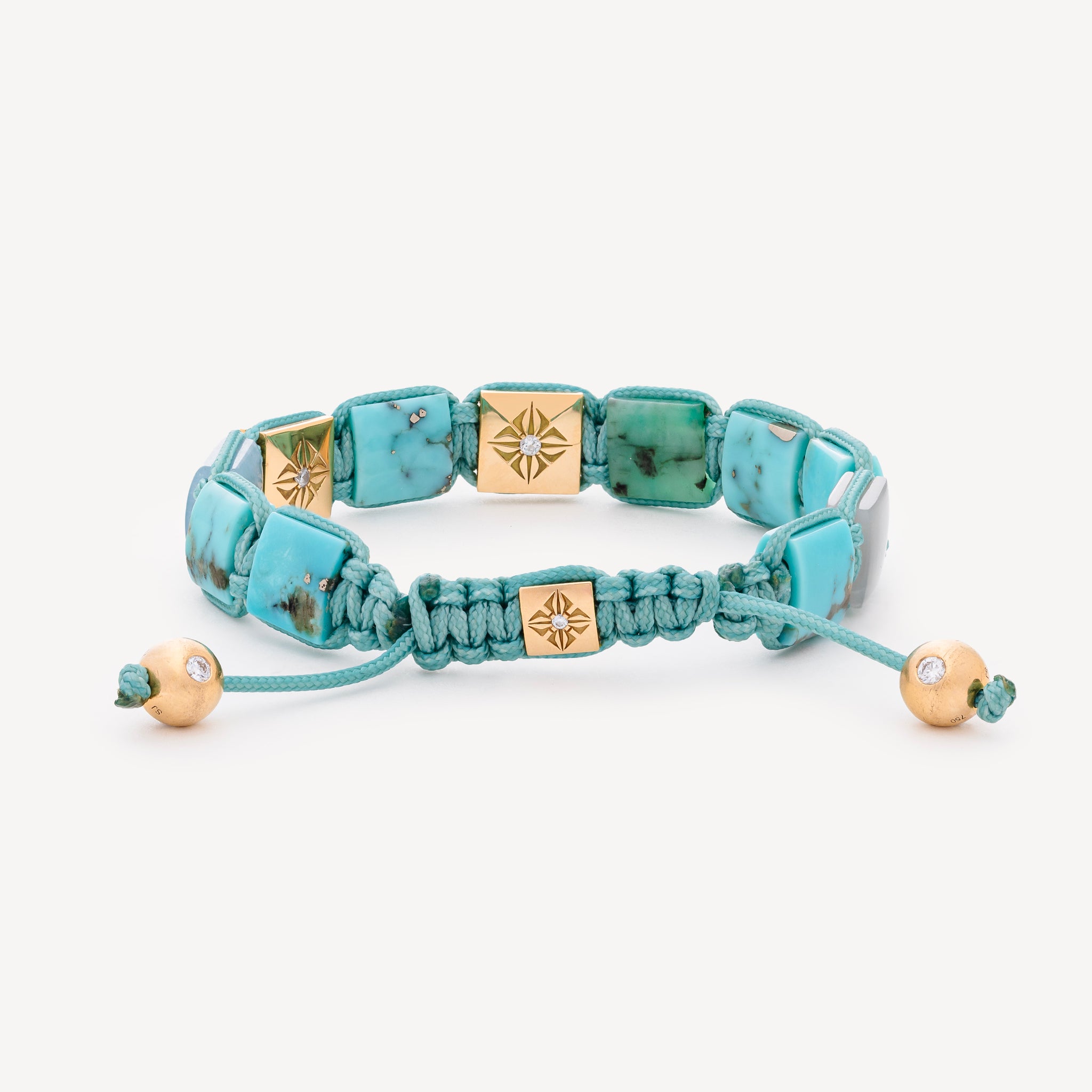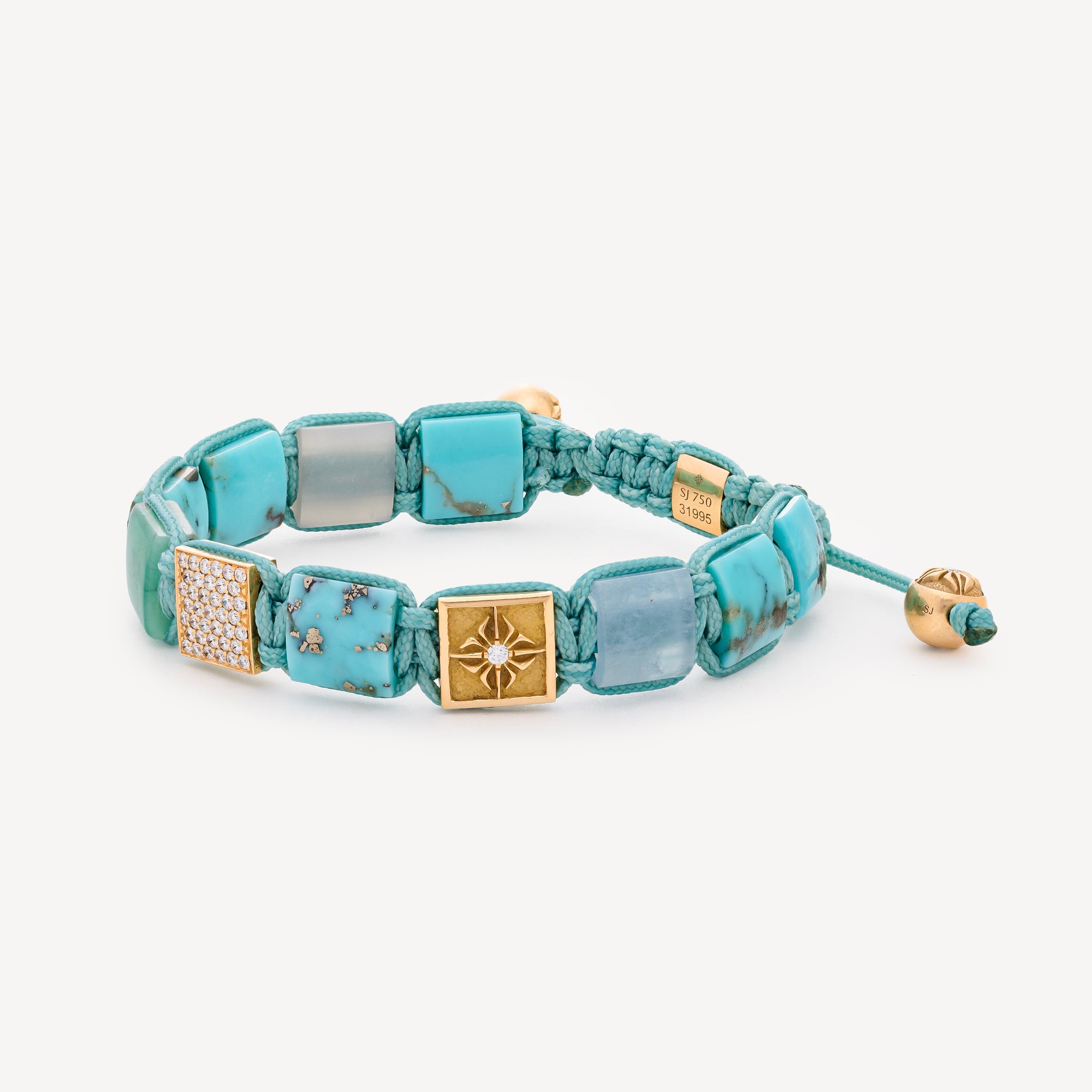 Bracelet monté sur un cordon turquoise composé de : 6 locks en turquoise, 2 locks en pierre de lune, 1 lock en émeraude, 1 lock en or jaune orné de 2 diamants blancs, 1 lock en or jaune pavé de diamants blancs, 1 lock fermoir orné d’un diamant blanc et 2 beads en or jaune ornées de 2 diamants blancs.