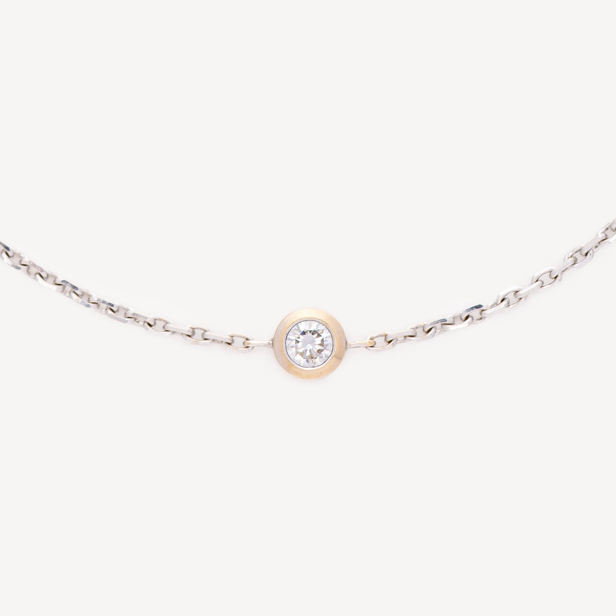 Une chaîne en or blanc sur laquelle un valeureux diamant de 0.10ct trône fièrement. Le fermoir en or blanc de 18 carats et une échelle de trois anneaux vous permettront d'ajuster la taille du bijou.