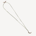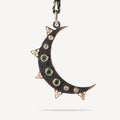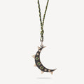 Diese raffinierte, mit Finesse gewebte Halskette verfügt über einen Halbmondanhänger aus Silber und Gold, der prächtig mit Smaragden und Diamanten verziert ist.