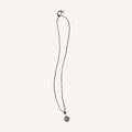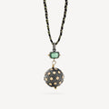 Pendentif planète en argent et or jaune orné d’étoiles, et surplombé d’une émeraude. Monté sur un cordon tressé kaki et noir.