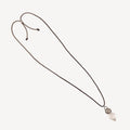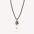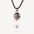 Diese außergewöhnlich feine Halskette aus Lederfaden zeigt als Anhänger einen Tropfen Quarzwasser, der durch eine zarte Silberkugel mit himmlischen Mustern aus Sternen und Mond in Gold ergänzt wird.