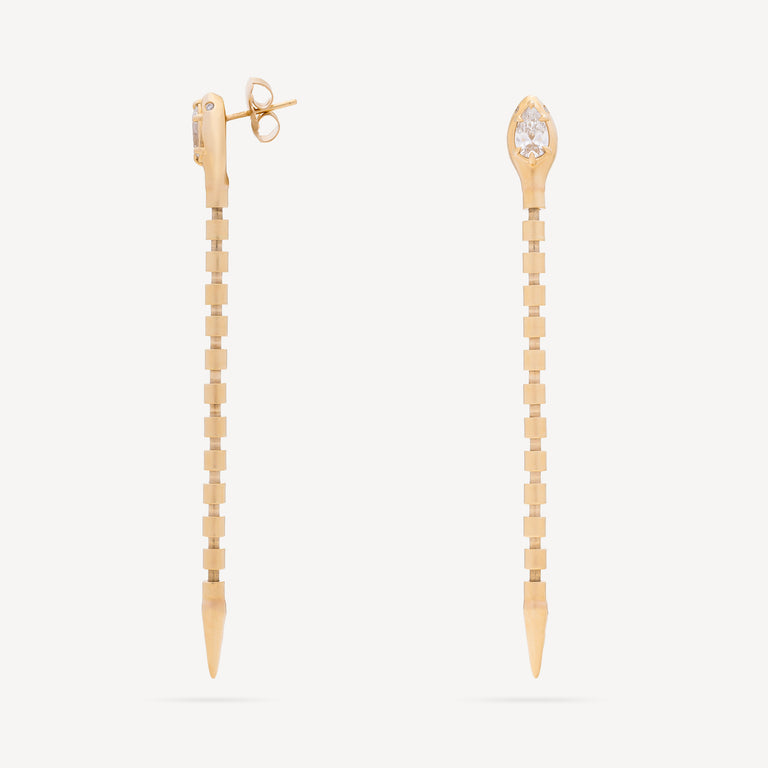Fabriquées à partir d'or jaune 14 carats et composées d'une chaîne souple, les boucles d'oreilles serpent sont extrêmement sexy. Elles dégagent une sensualité certaine grâce à leur mouvement fluide. Au sommet des boucles d'oreilles, repose une tête de serpent en or, ornée d'un diamant de laboratoire en forme de poire. Symbole de pureté et de force, le diamant amplifie l’énergie et clarifie l’esprit.