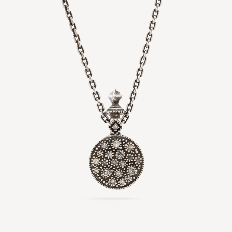 Le collier Moonlight est sublimé par un pendentif en forme de rond orné de diamants blancs.