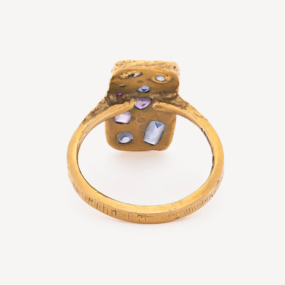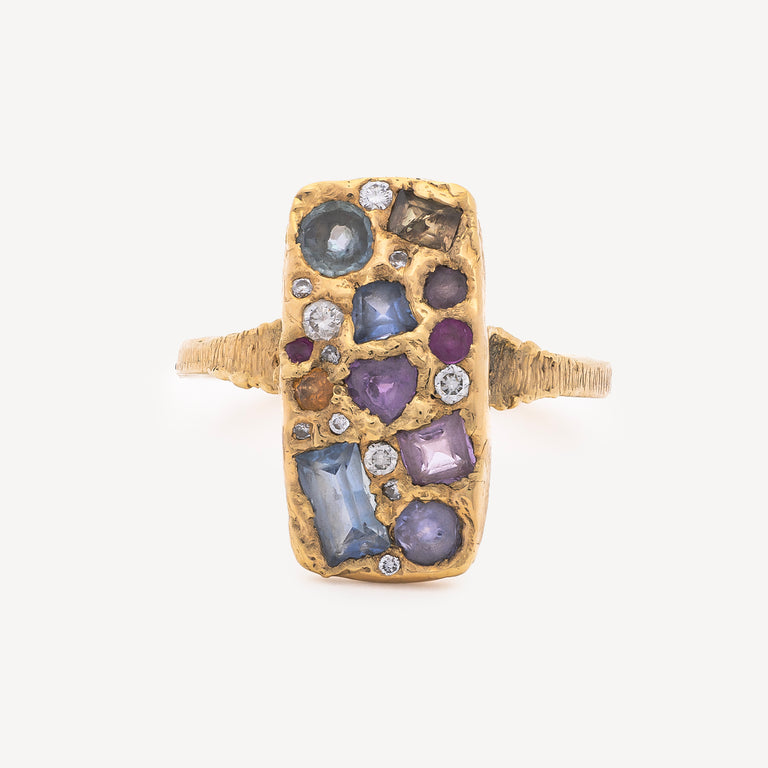 La bague Kaleidoscope de Leto Lama se distingue par son design rectangulaire graphique, incrusté de saphirs multicolores et de diamants. Véritable jeu de lumière et de couleurs, cette création capte le regard par sa composition contemporaine. Le saphir est associé à l’équilibre et à la clarté de l’esprit, tandis que le diamant symbolise la force intérieure et la pureté.