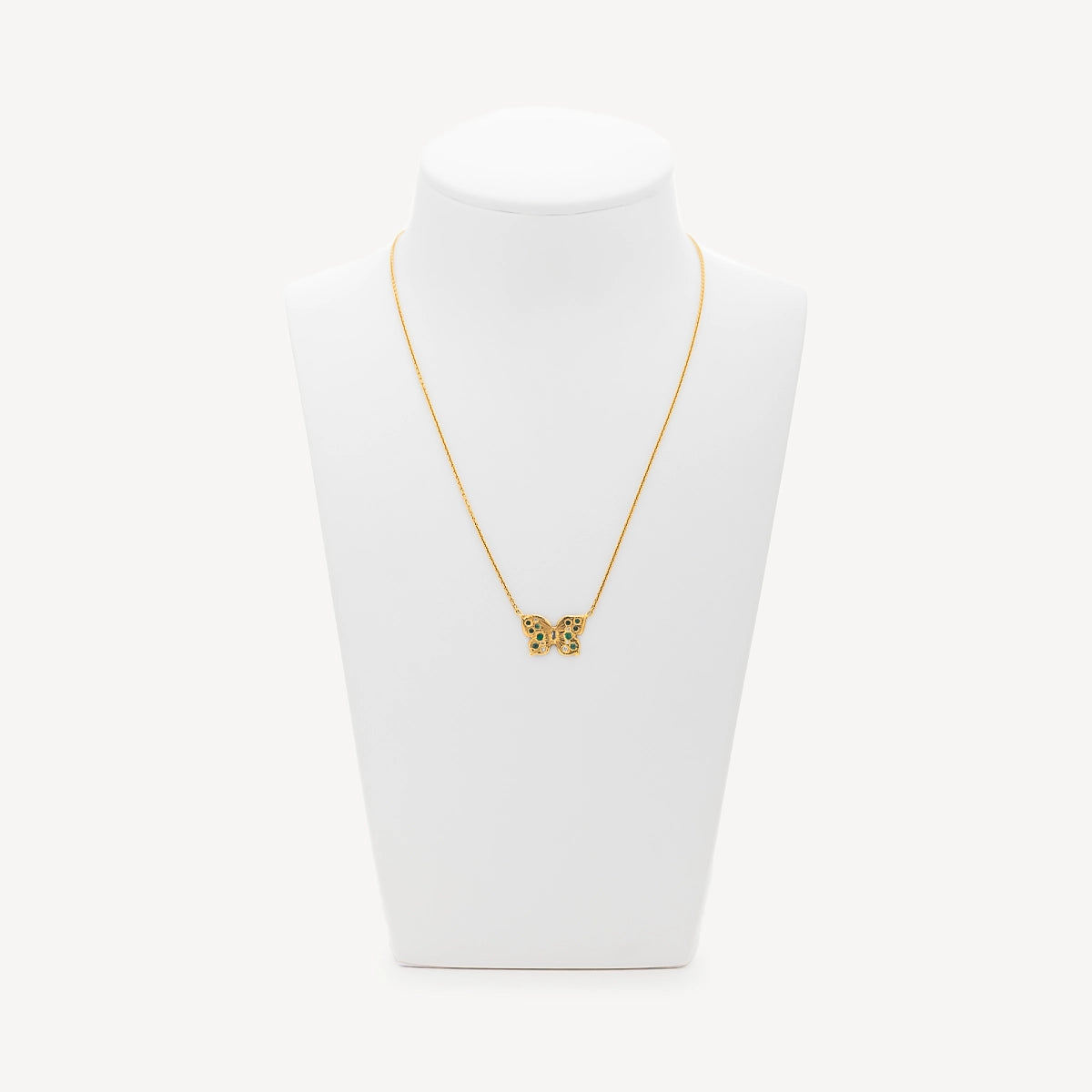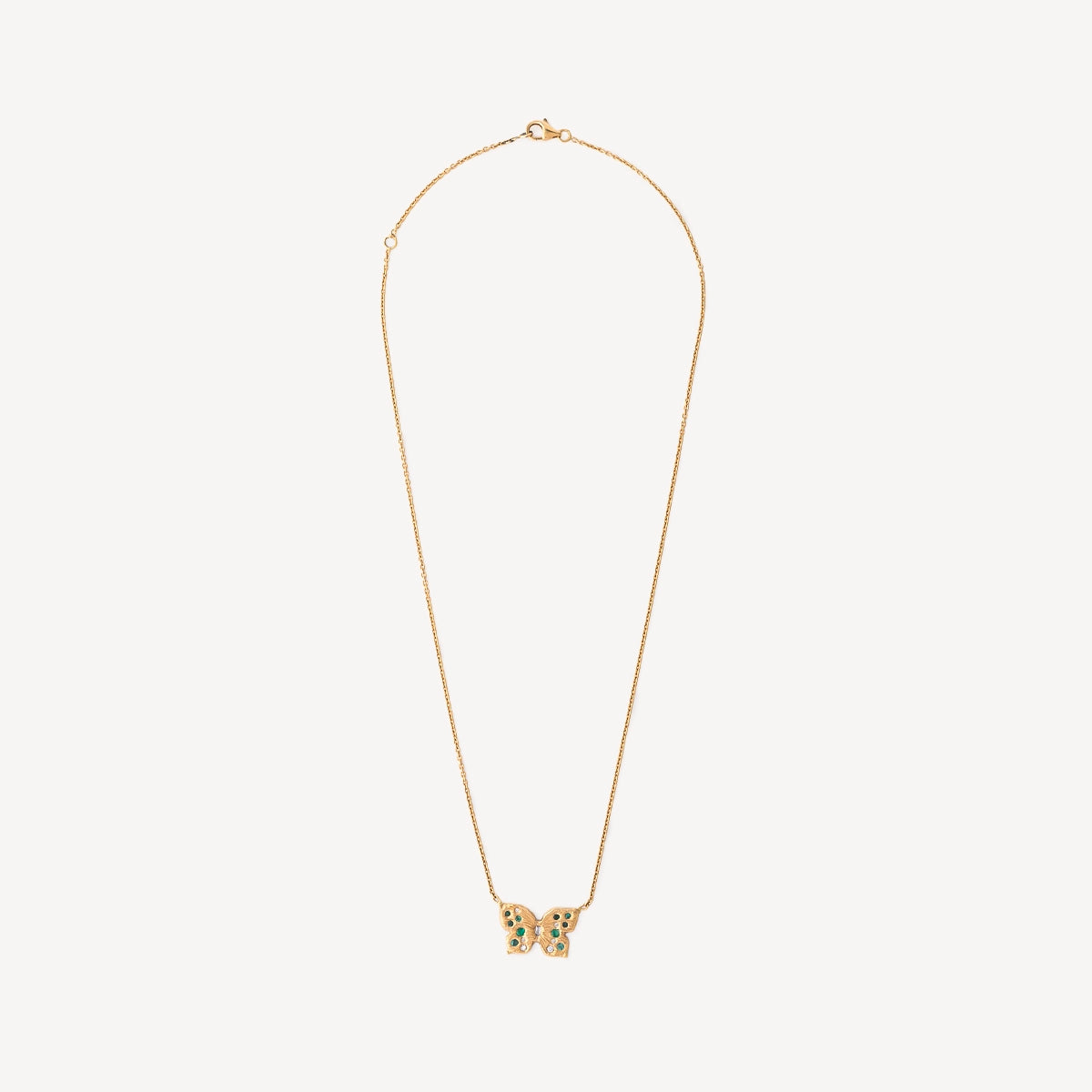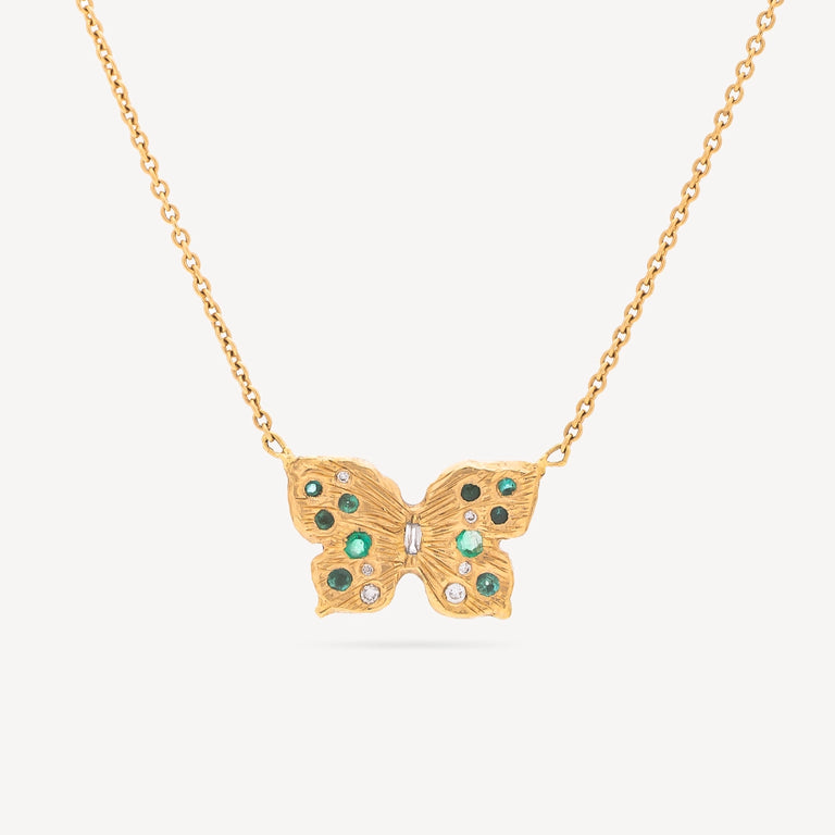 Le collier Butterfly Émeraude de Leto Lama célèbre la grâce et la métamorphose à travers un motif papillon délicatement incrusté d’émeraudes et de diamants blancs. Les pierres précieuses captent la lumière avec finesse, évoquant un éclat végétal et lumineux. L'émeraude est associée à l’harmonie, au renouveau et à l’amour sincère, tandis que le diamant symbolise la pureté et la force intérieure, faisant de ce collier un bijou aussi précieux que porteur de sens.