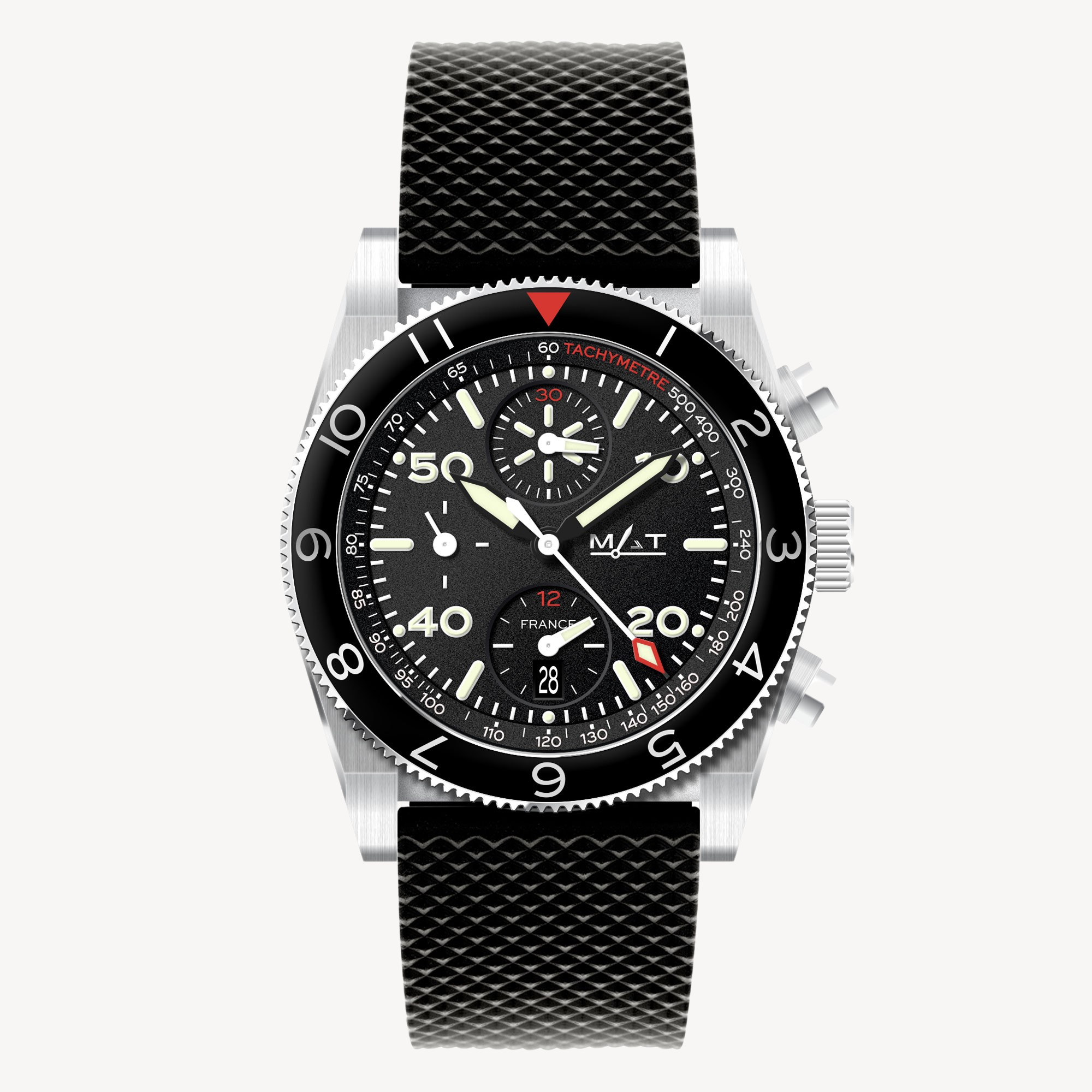 Durchmesser 42,5 mm – Gehäuse aus 316L-Edelstahl – 2,8 mm dickes Saphirglas, kratzfest, entspiegelt – wasserdicht bis 200 Meter – verschraubte Krone und Rückseite – schwarzes Zifferblatt – Super Luminova C3-Indizes und Zeiger – Schweizer mechanisches Uhrwerk mit Anleitung Wicklung - Valjoux 7750