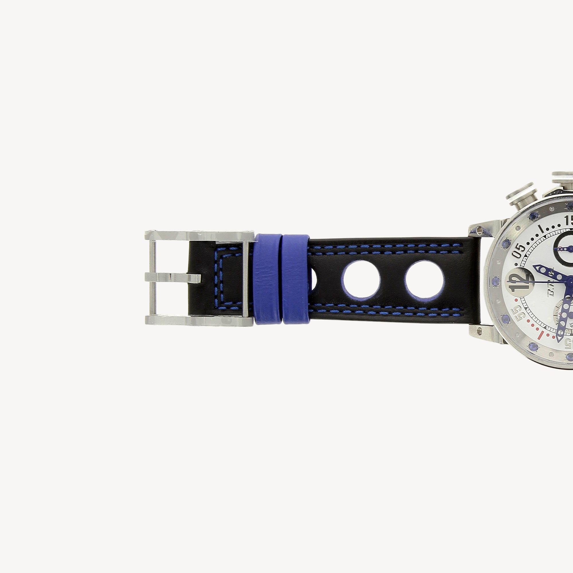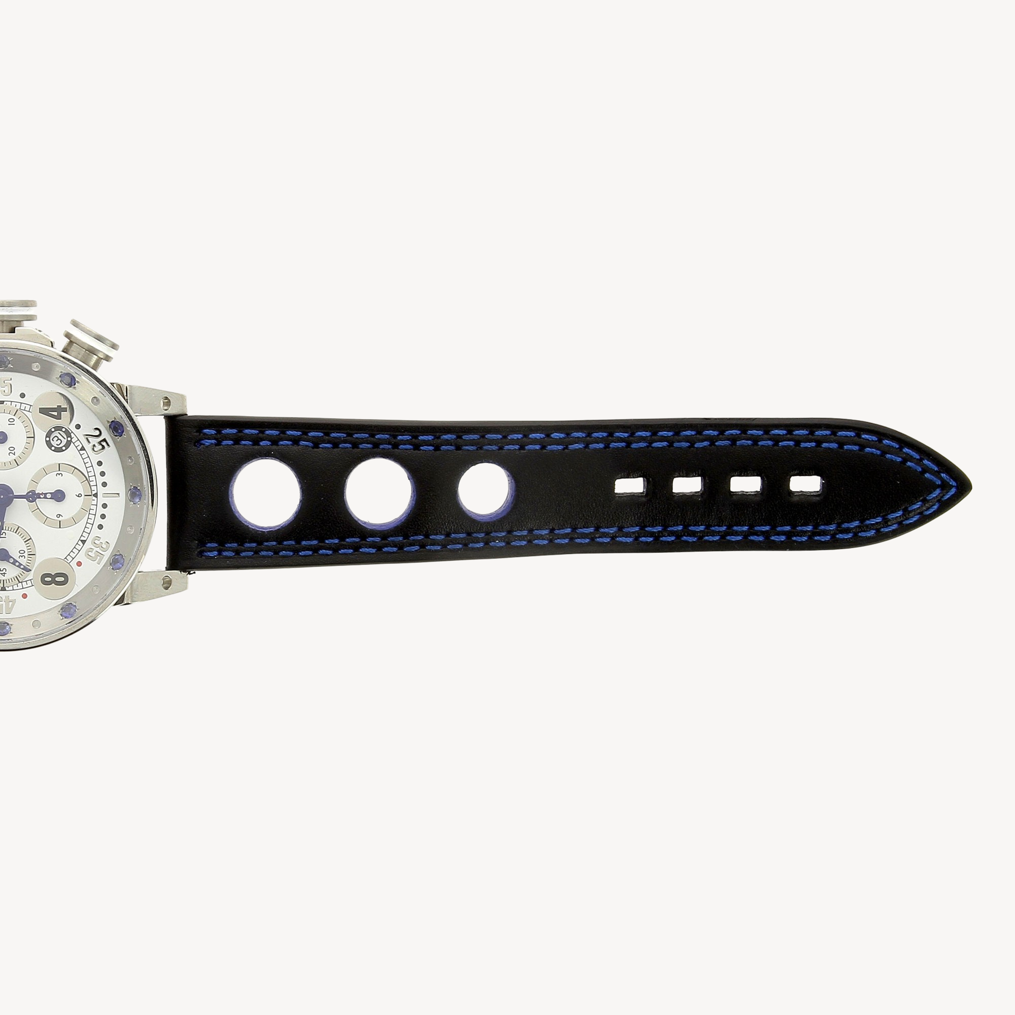 Automatisches Chronographenwerk Valjoux 7753, Durchmesser 44 mm. Poliertes Edelstahlgehäuse, 12 blaue Saphire auf dem Flansch. Krone und Drücker aus weiß lackiertem, grauem Edelstahl. Hörner aus grauem Edelstahl. Saphirglas von innen nach außen (Rückseite und Lünette). Weißes Zifferblatt mit grauen Applikationen. Superhelle dunkelblaue Zeiger. Superfeine Edelstahlschrauben. Schwarzes Lederarmband mit Löchern, doppelte dunkelblaue Naht. Wasserdicht 100 m.