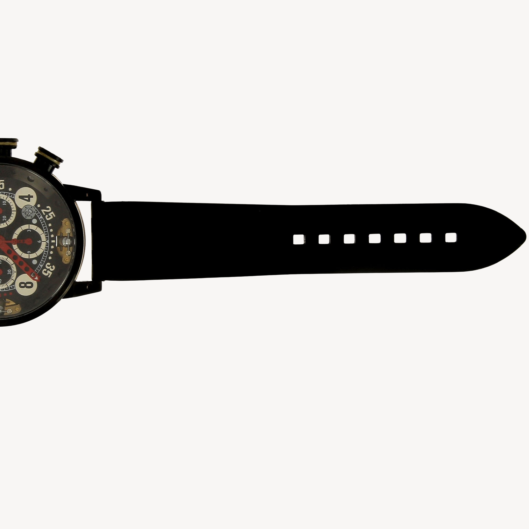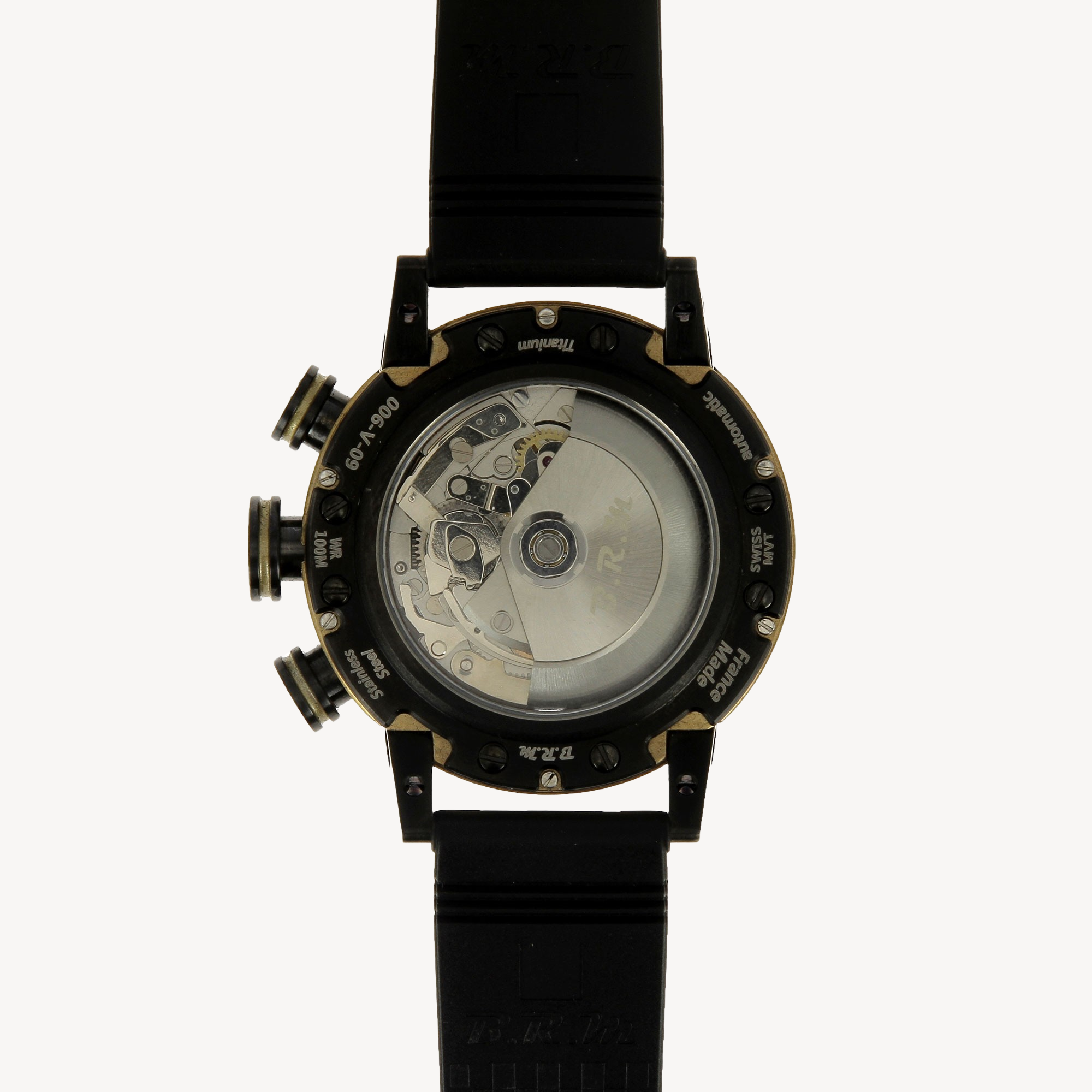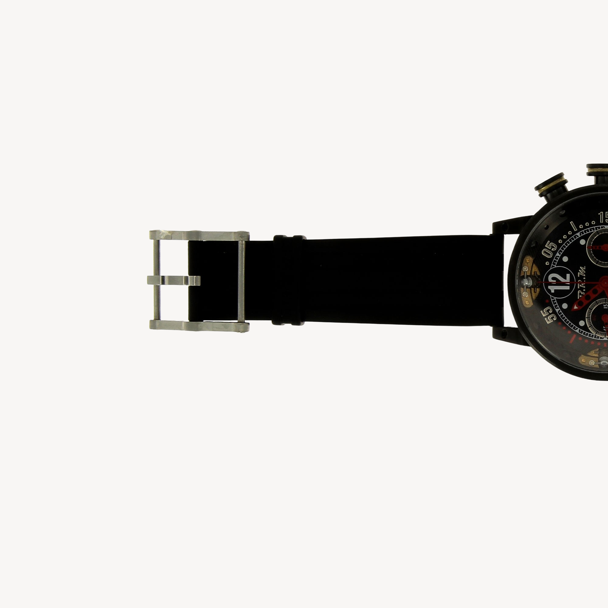 Automatisches Chronographenwerk Valjoux 7753, Durchmesser 46 mm. Gehäuse aus Bronze, Rückseite und Lünette aus schwarzem PVD-Edelstahl. 5N farbige Federn. Schwarze PVD-Krone und Drücker lackiert in der Farbe 5N. Hörner aus schwarzem PVD-Edelstahl. Saphirglas von innen nach außen (Rückseite und Lünette). Schwarzes Zifferblatt, graue Applikationen. Superhellrote Zeiger. Superfeine Edelstahlschrauben. Schwarzes Kautschukarmband. Wasserdicht 100 m.