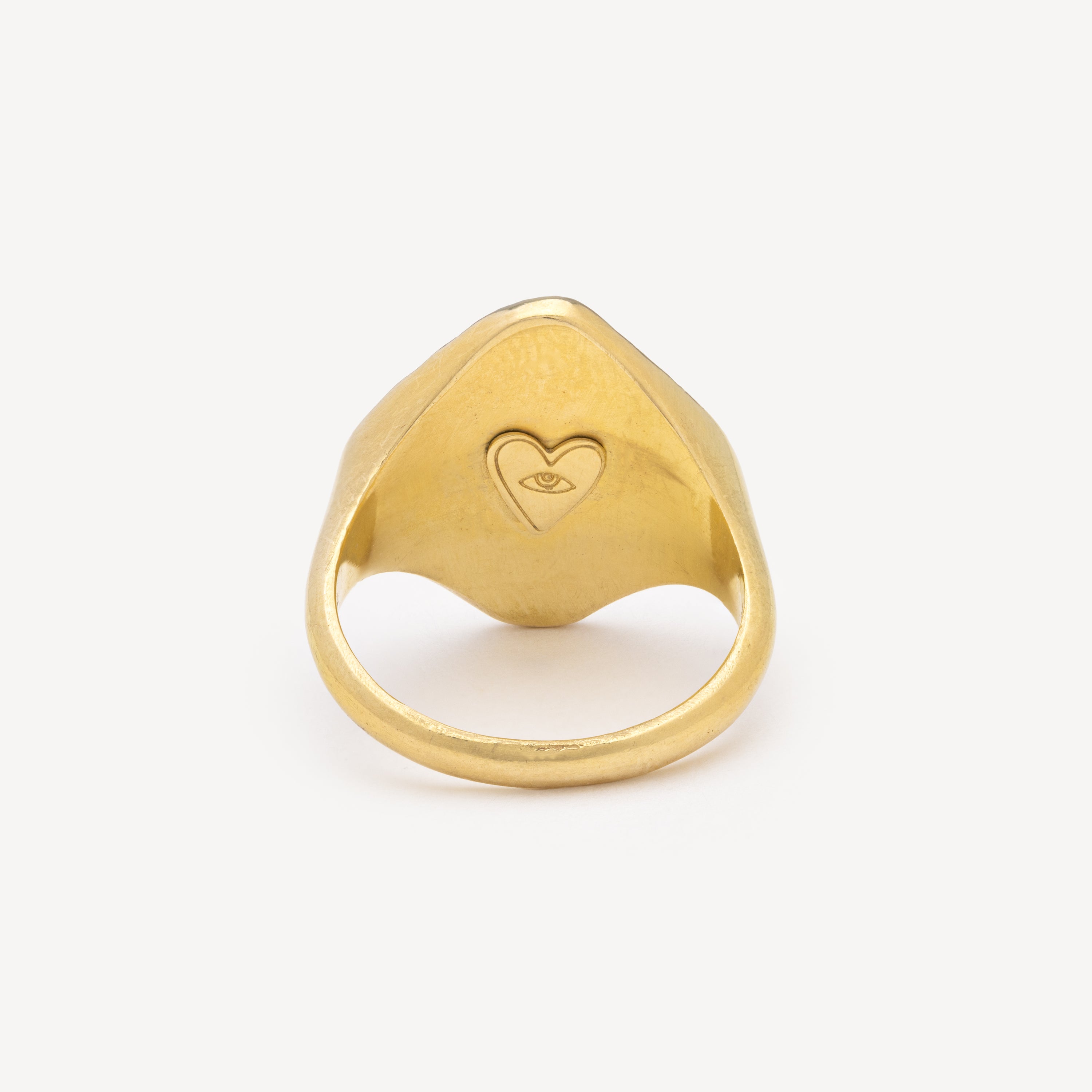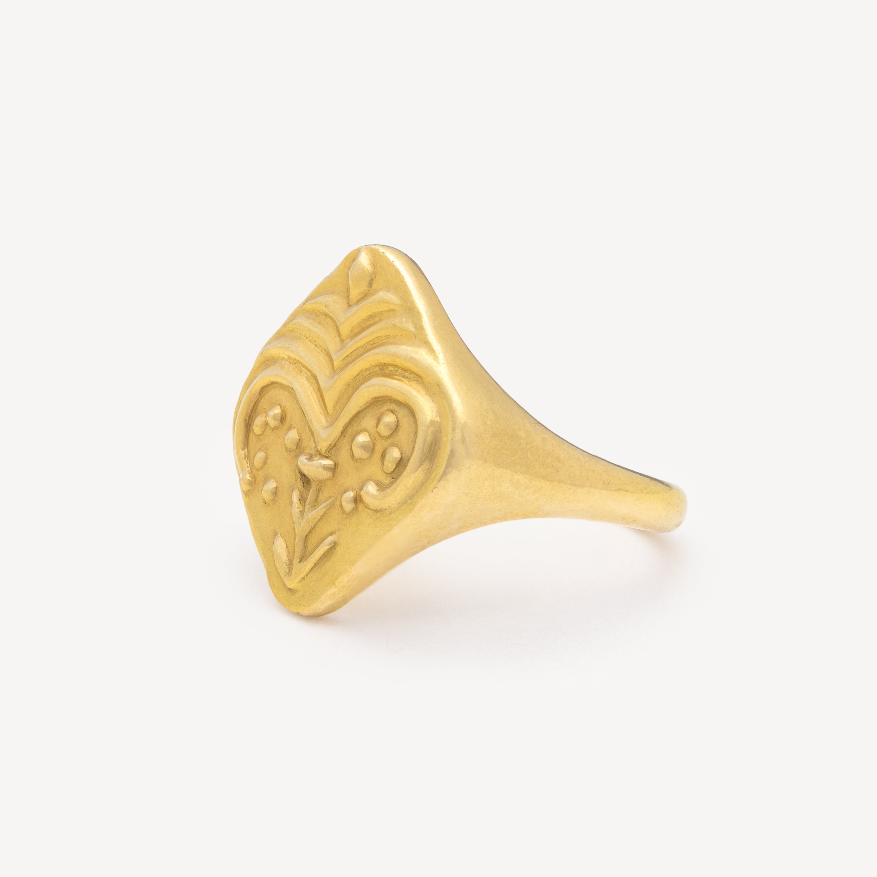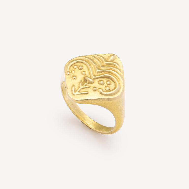 Cette unique chevalière est ornée d'un motif typique des amphores de la Grèce antique. Fabriquée à la main en or jaune 18 carats, elle symbolise la paix et la prospérité de manière moderne et élégante.