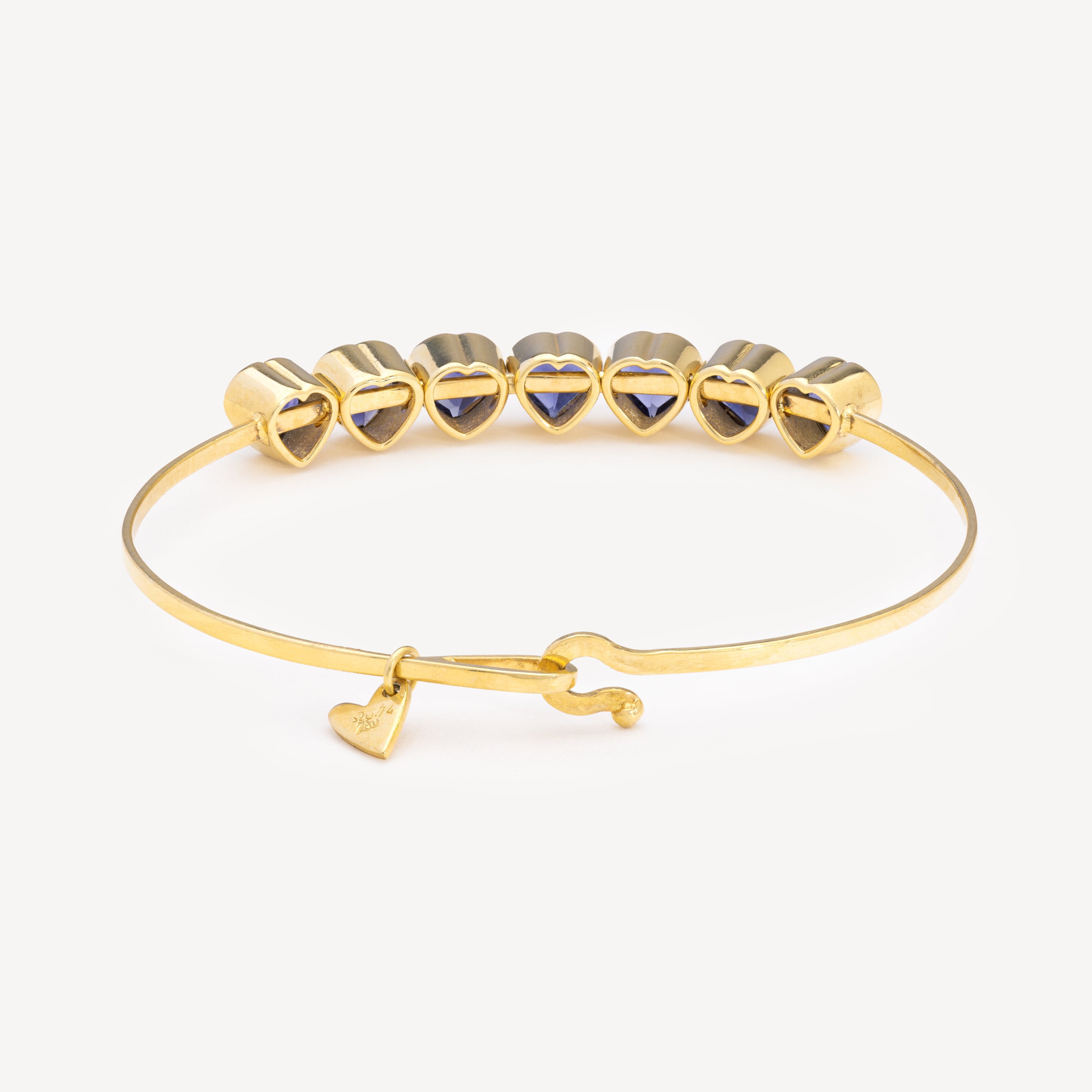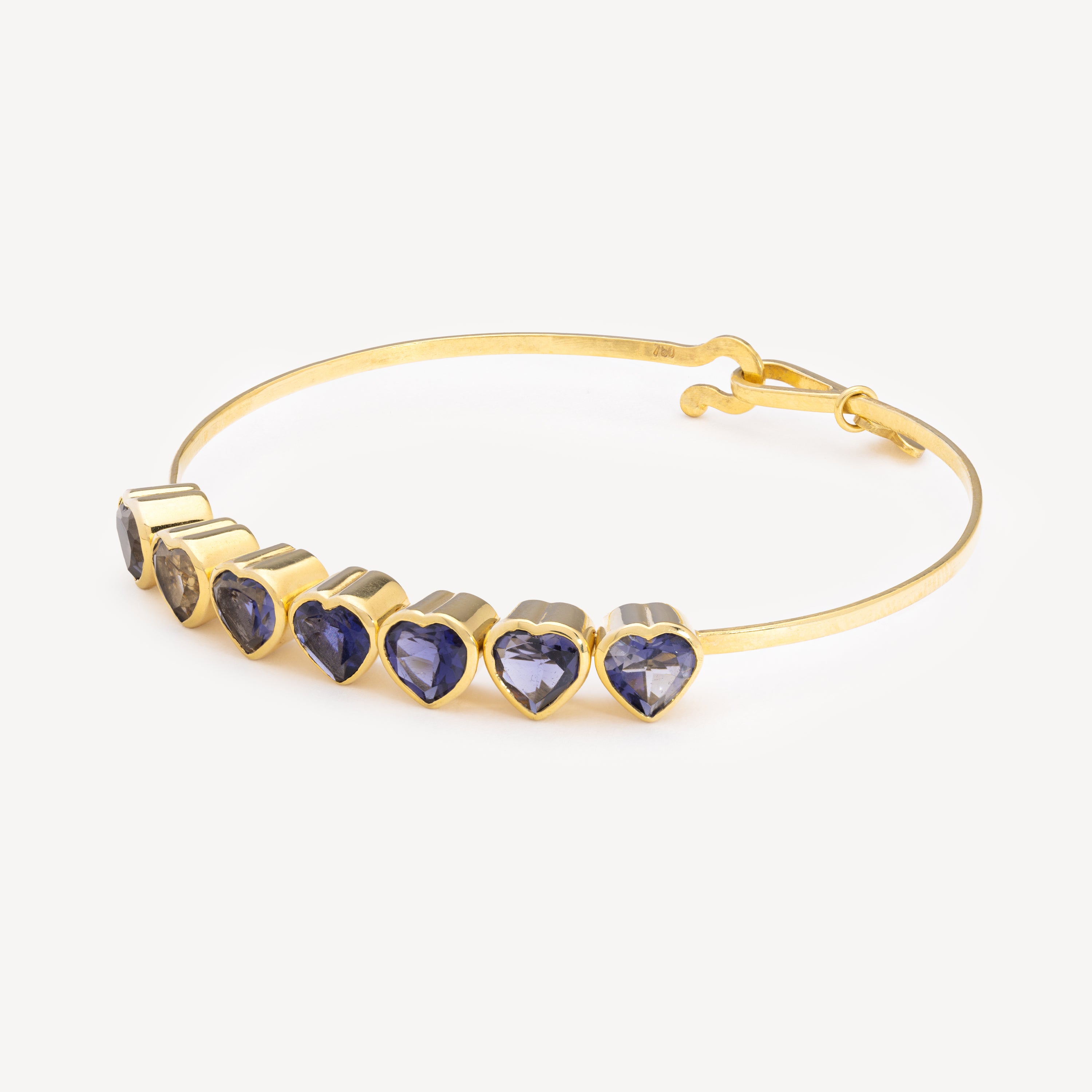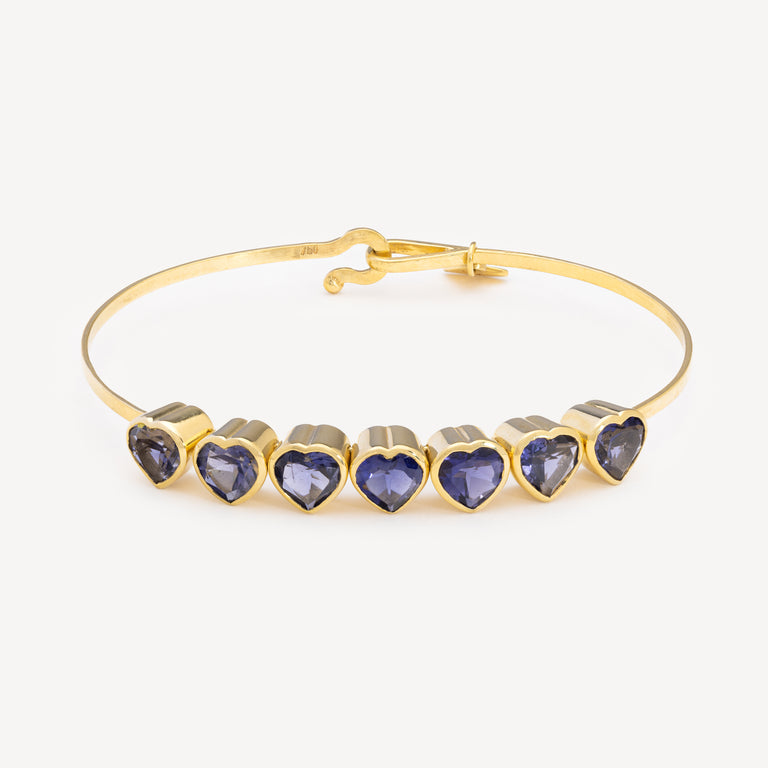Ce merveilleux bracelet en or jaune 18 carats est agrémenté d'une lignée de cœurs en iolite. Ingénieusement conçu, ce jonc unique permet aux pierres de bouger légèrement, ajoutant une touche à la fois ludique et élégante à cette pièce.
