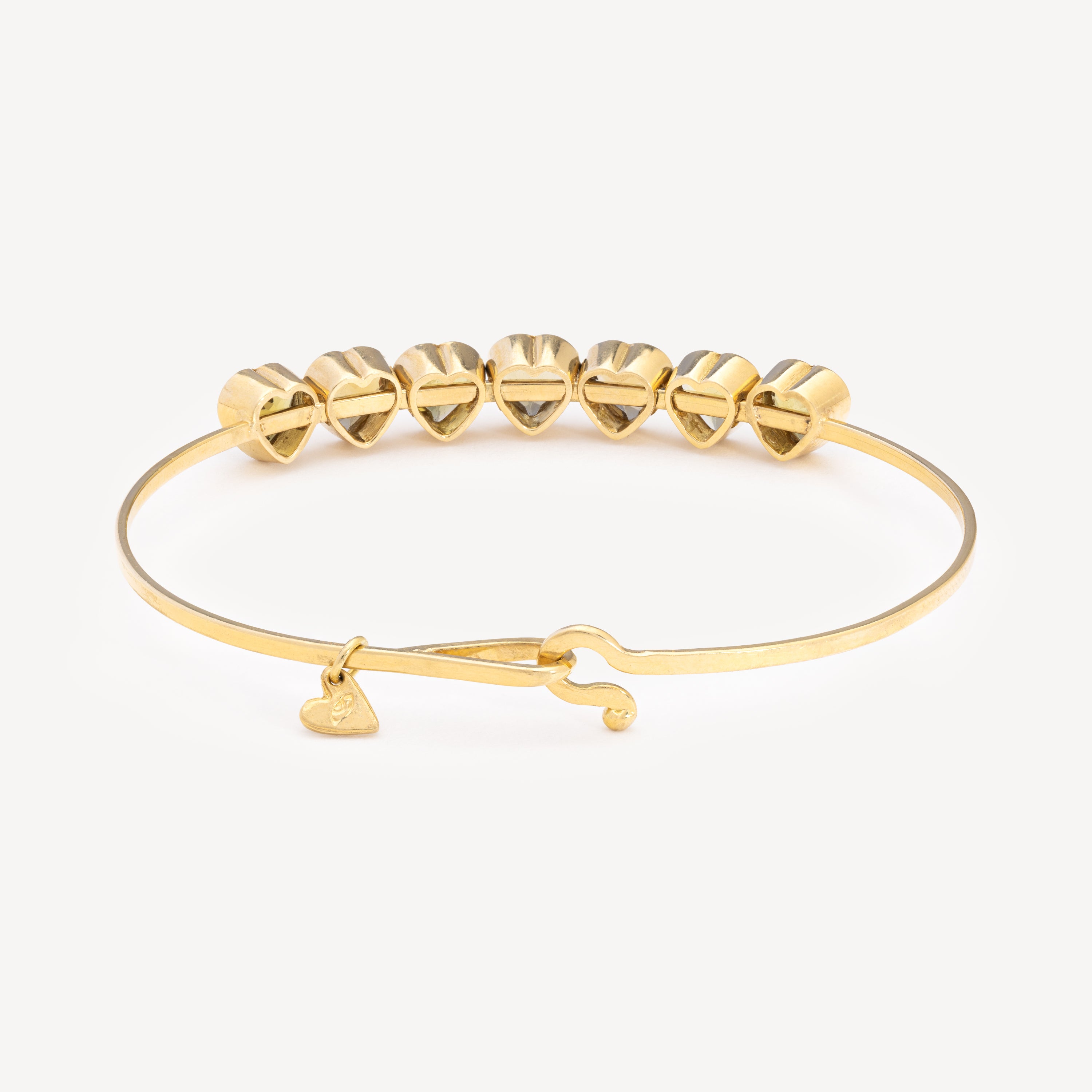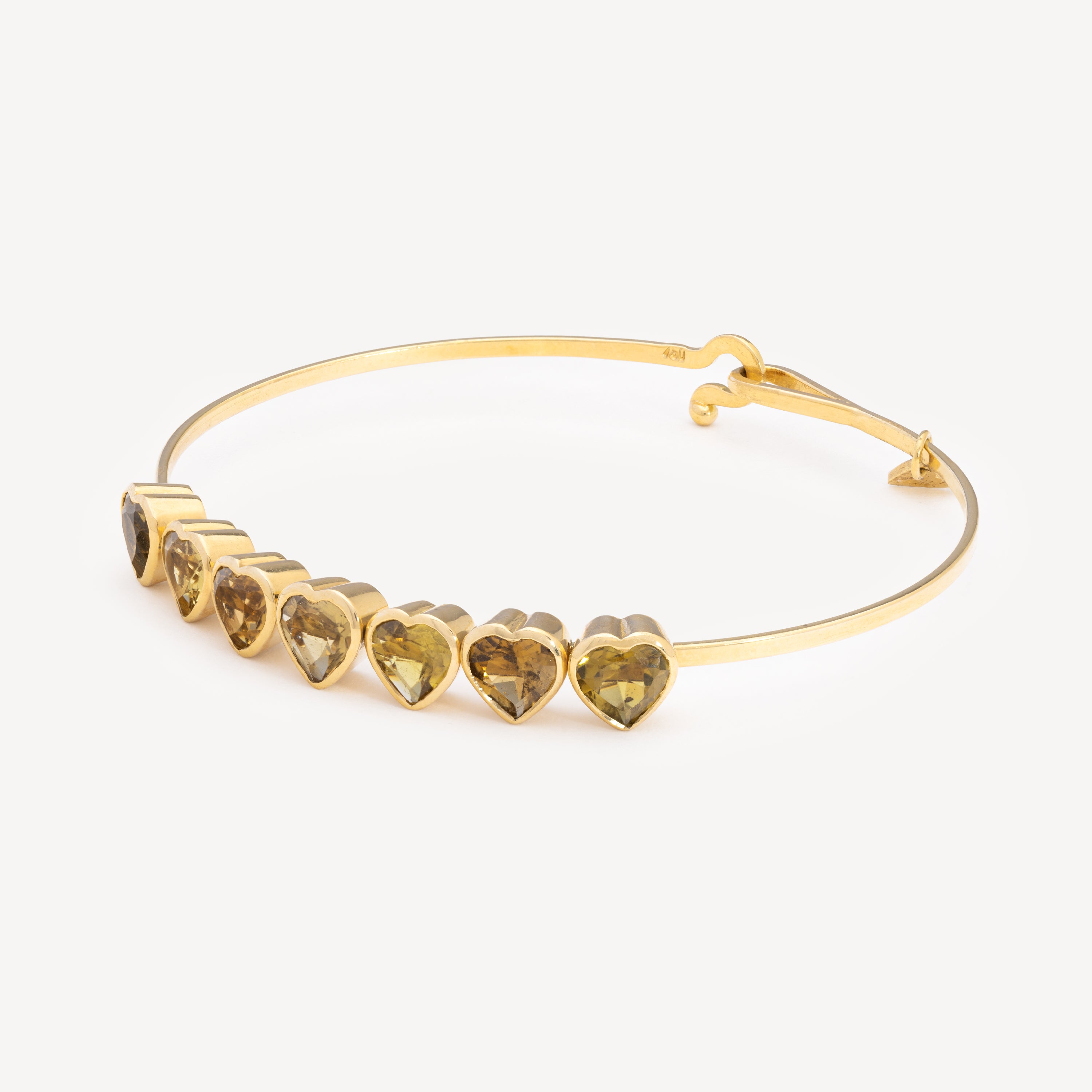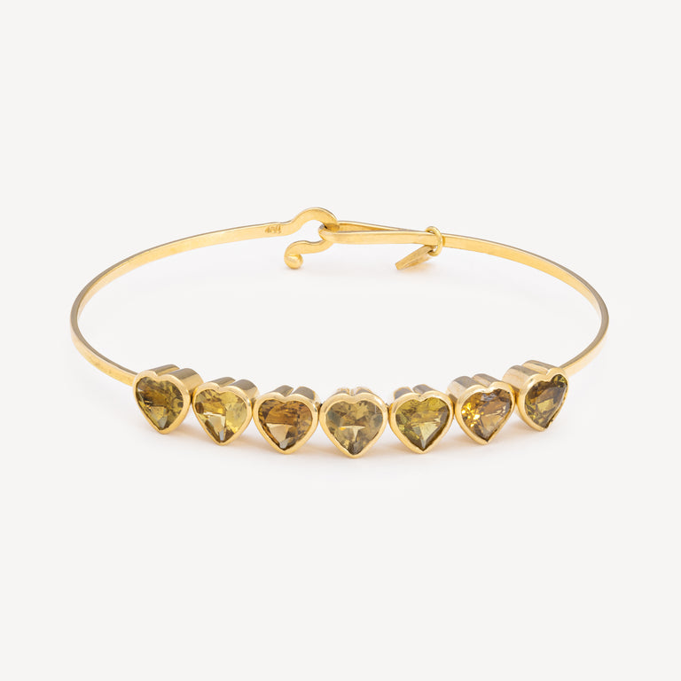 Ce merveilleux bracelet en or jaune 18 carats est agrémenté d'une lignée de cœurs en tourmaline jaune. Ingénieusement conçu, ce jonc unique permet aux pierres de bouger légèrement, ajoutant une touche à la fois ludique et élégante à cette pièce.