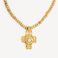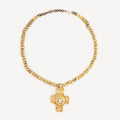 Collier vintage de perles dorées en métal finition dorée montées sur un cordon noir. Pendentif croix orné d’un cristal central.